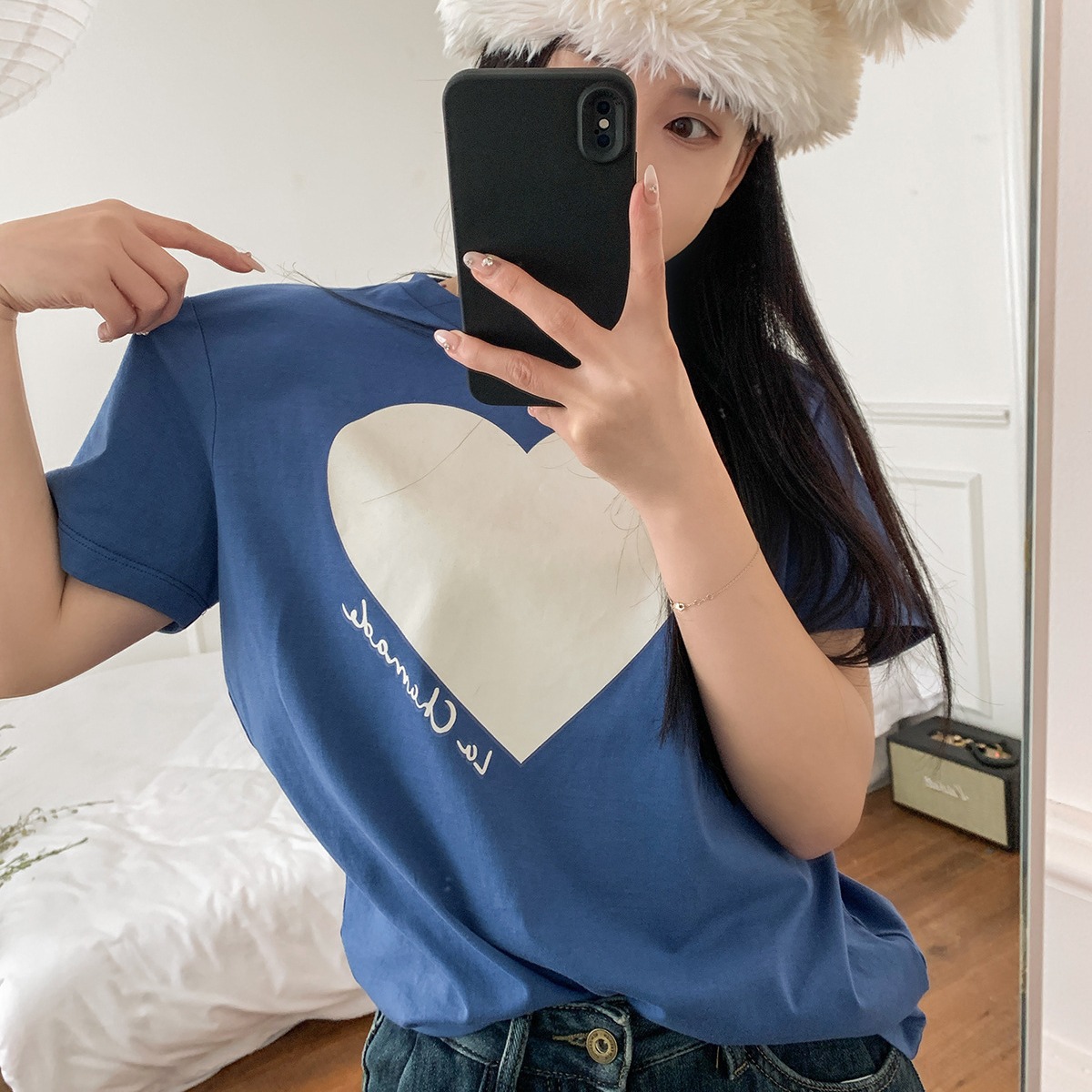 春夏法式爱心印花宽松圆领T恤克莱因蓝百搭短袖棉质潮T女