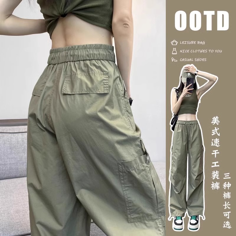 美式冰丝速干工装裤女夏季薄款高腰抽绳登山裤宽松休闲阔腿伞兵裤