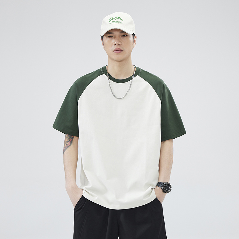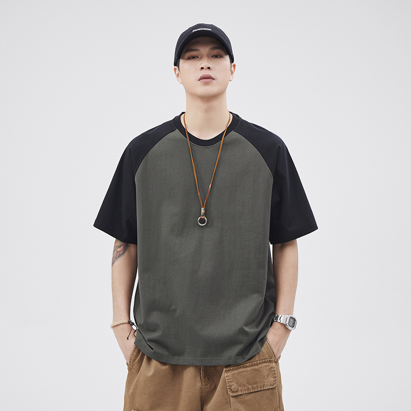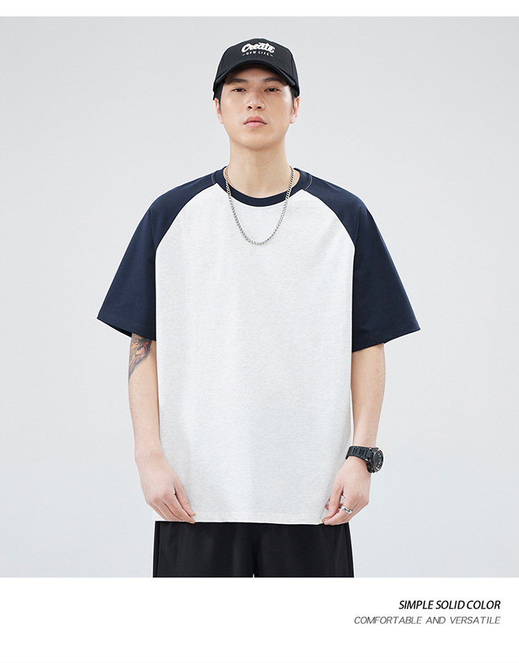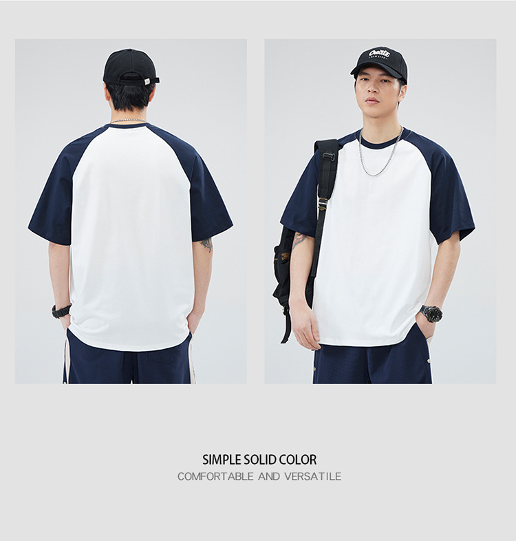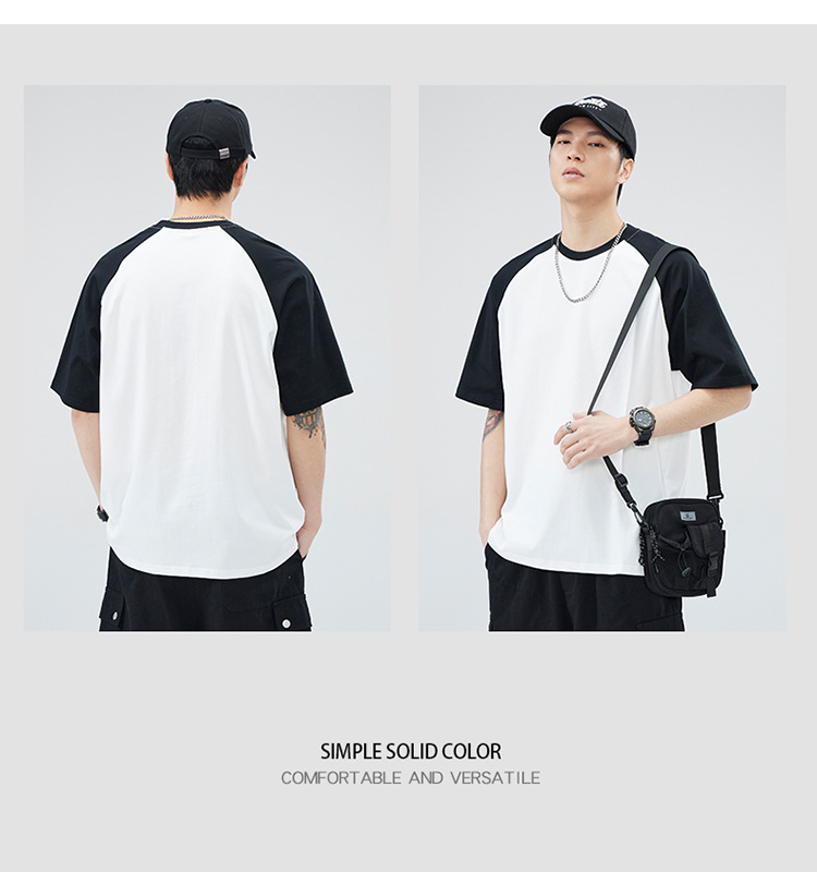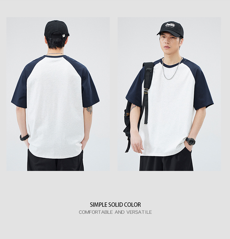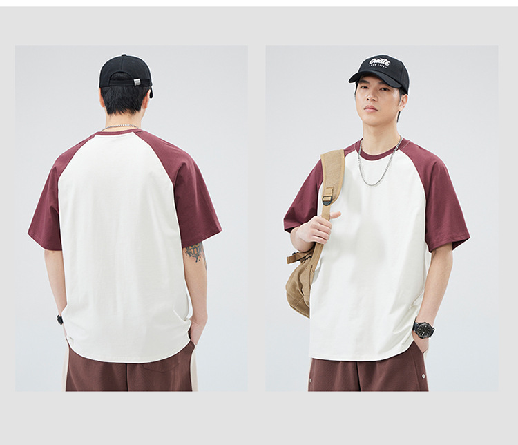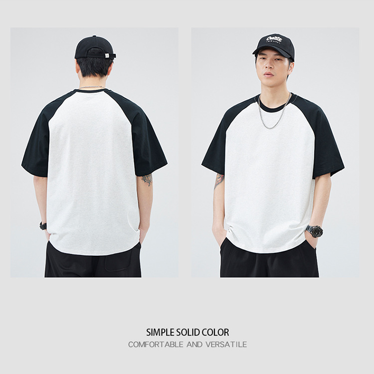 250G美式重磅插肩短袖t恤男士夏季潮牌宽松撞色休闲纯棉百搭体恤