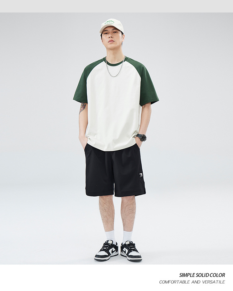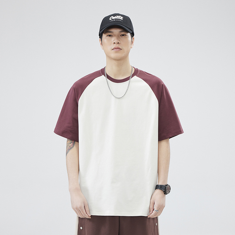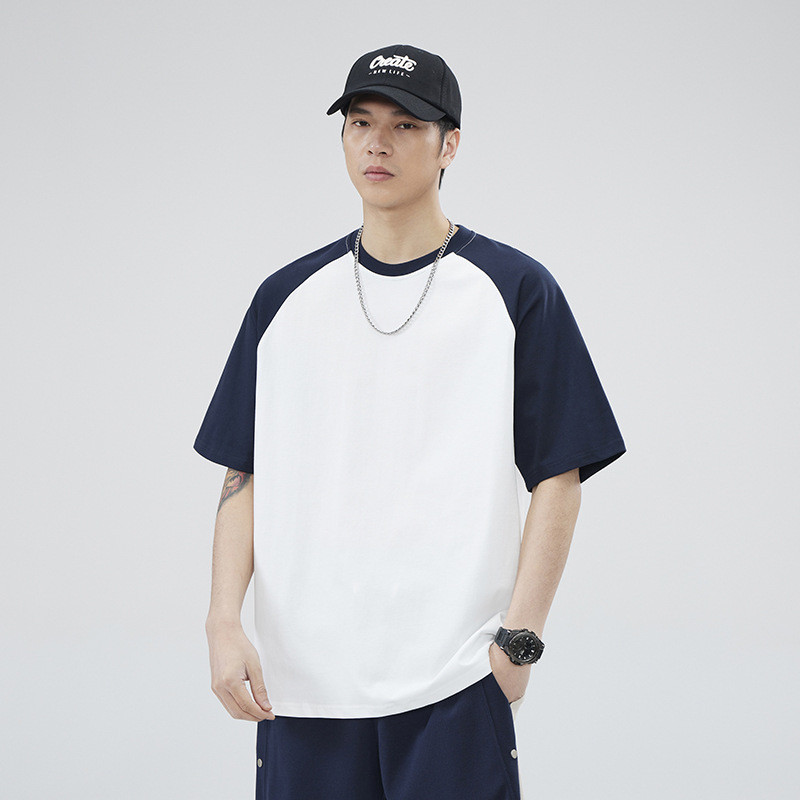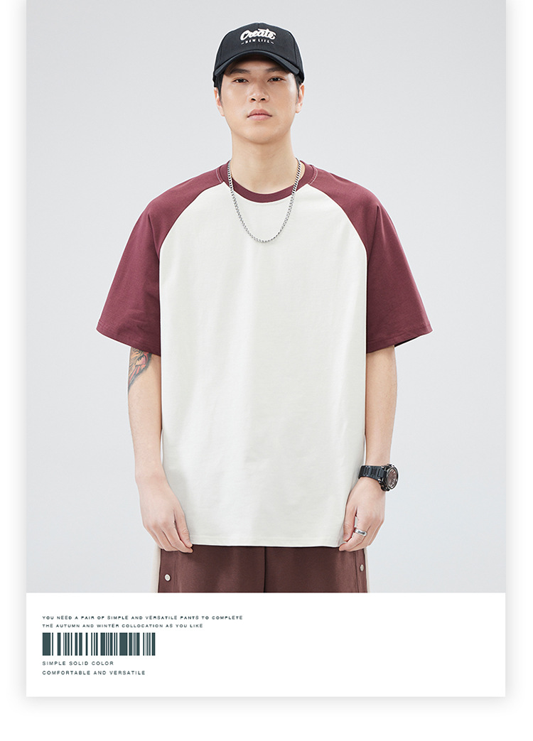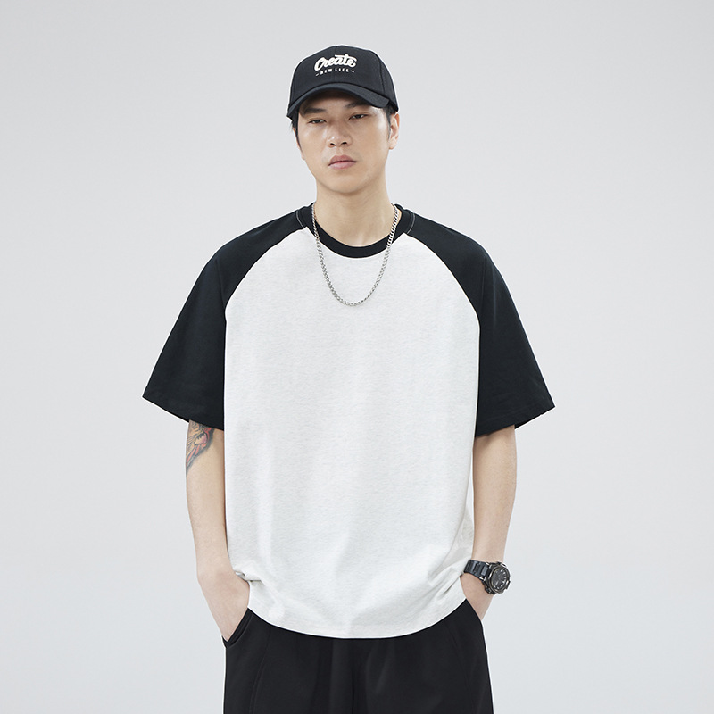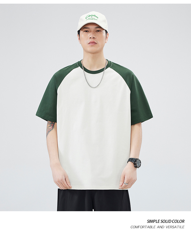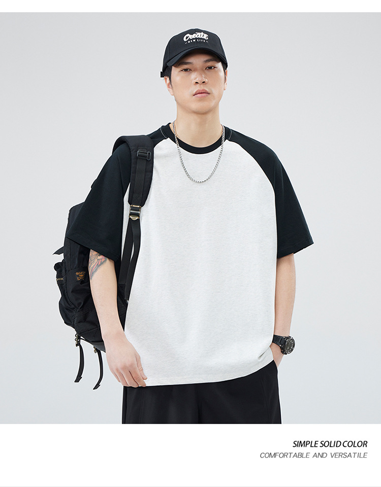 250G美式重磅插肩短袖t恤男士夏季潮牌宽松撞色休闲纯棉百搭体恤