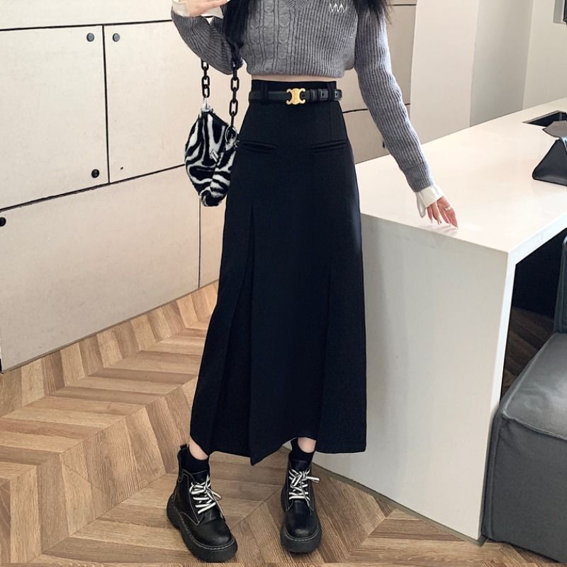 百褶长裙灰色西装半身女春夏中款高腰字小个子包臀直筒子代发