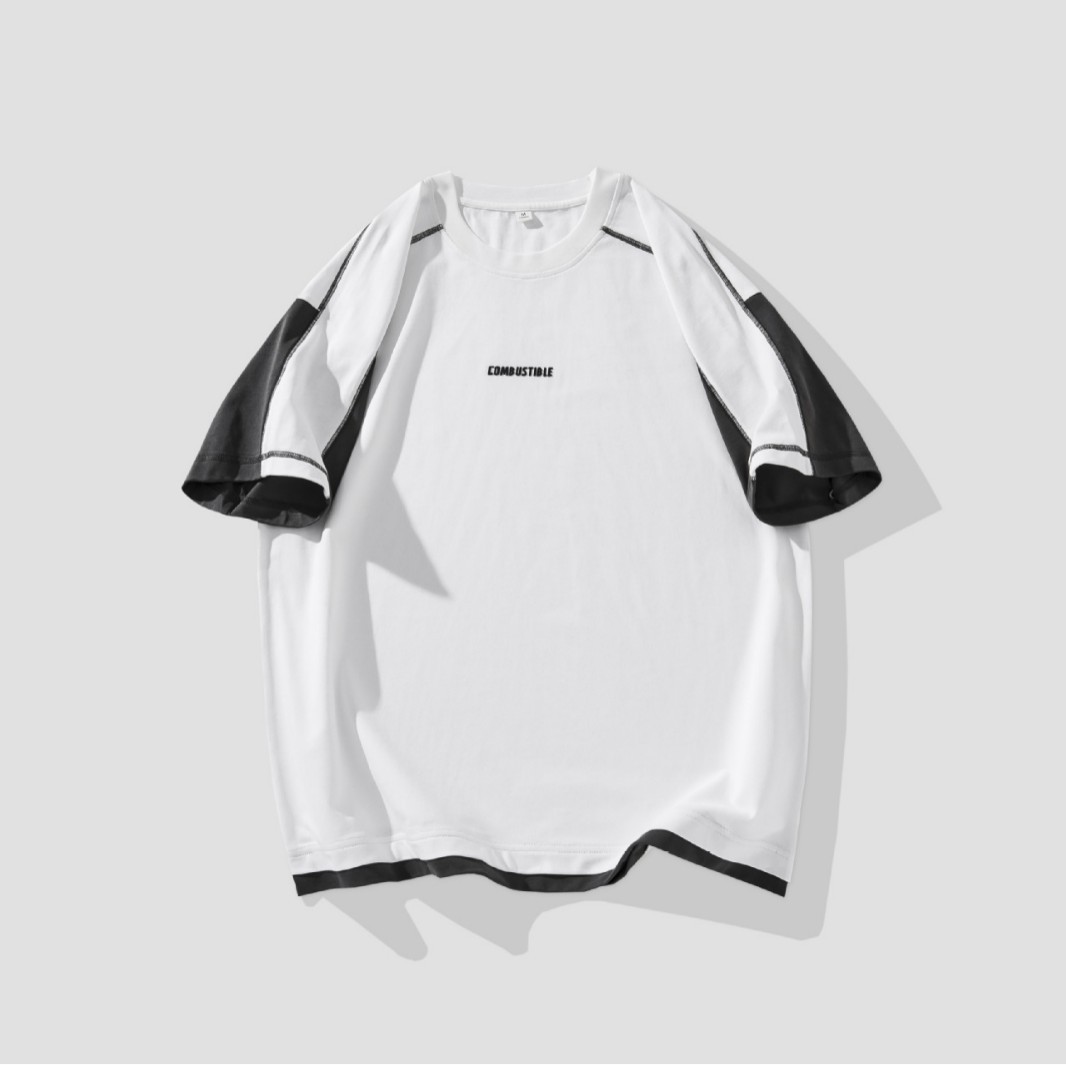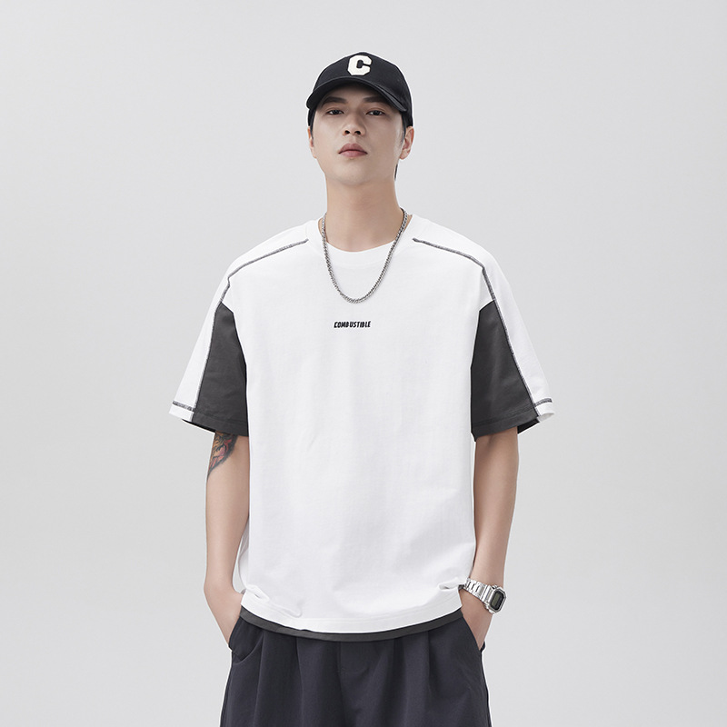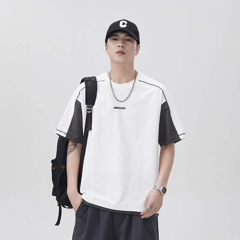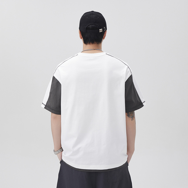 250g重磅纯棉假两件短袖t恤男宽松日系潮牌拼接拼色圆领男士上衣