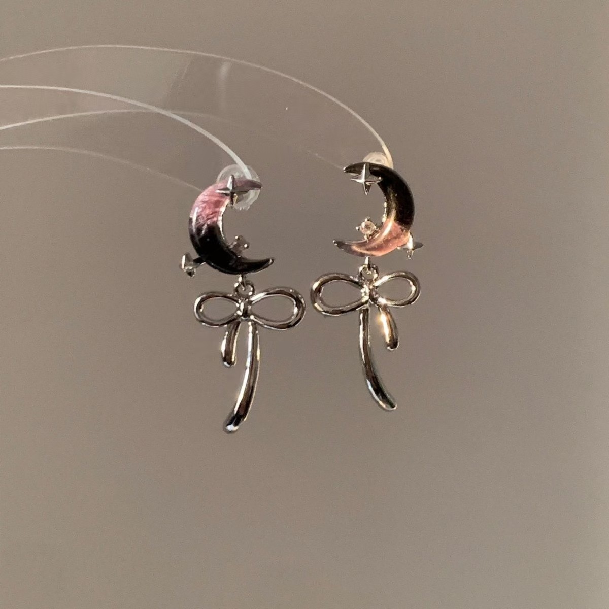 「巴比伦幻夜」小众设计感甜酷精致高级感月亮银色蝴蝶结耳环耳夹