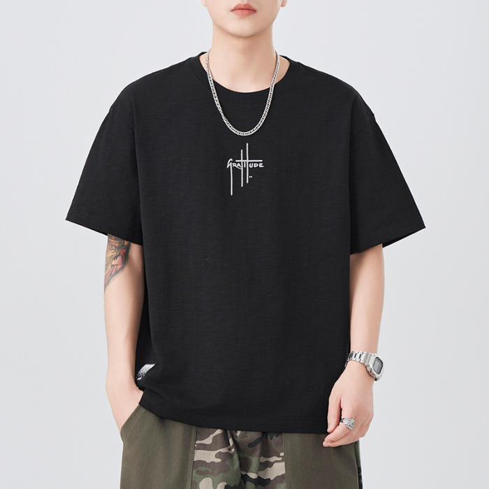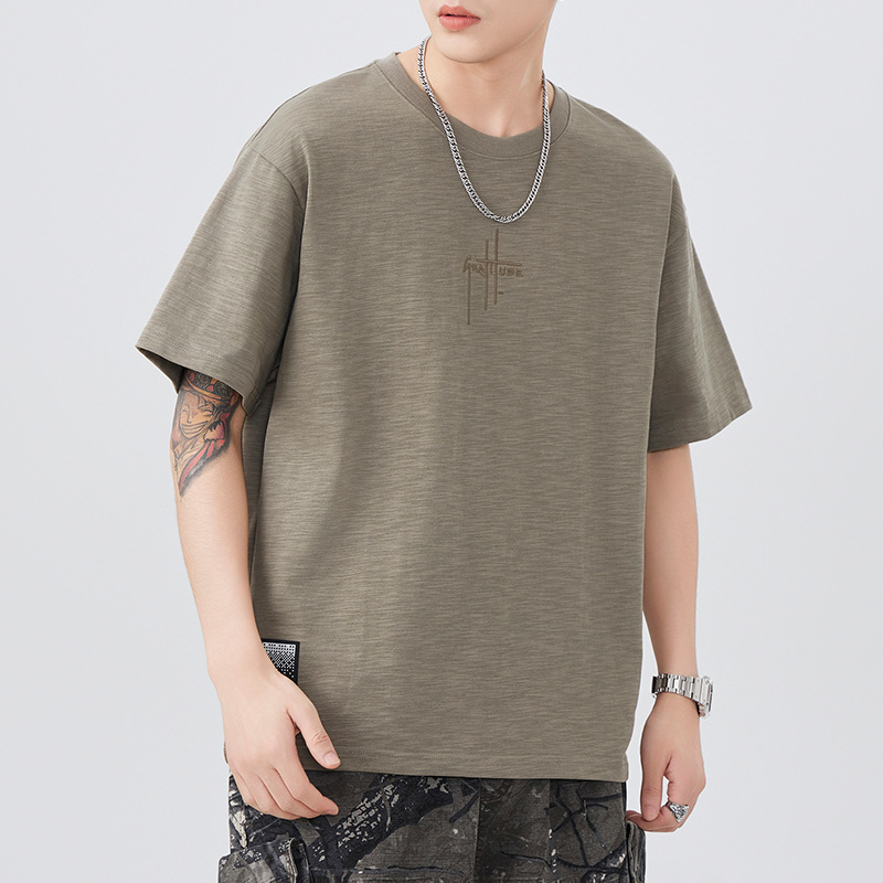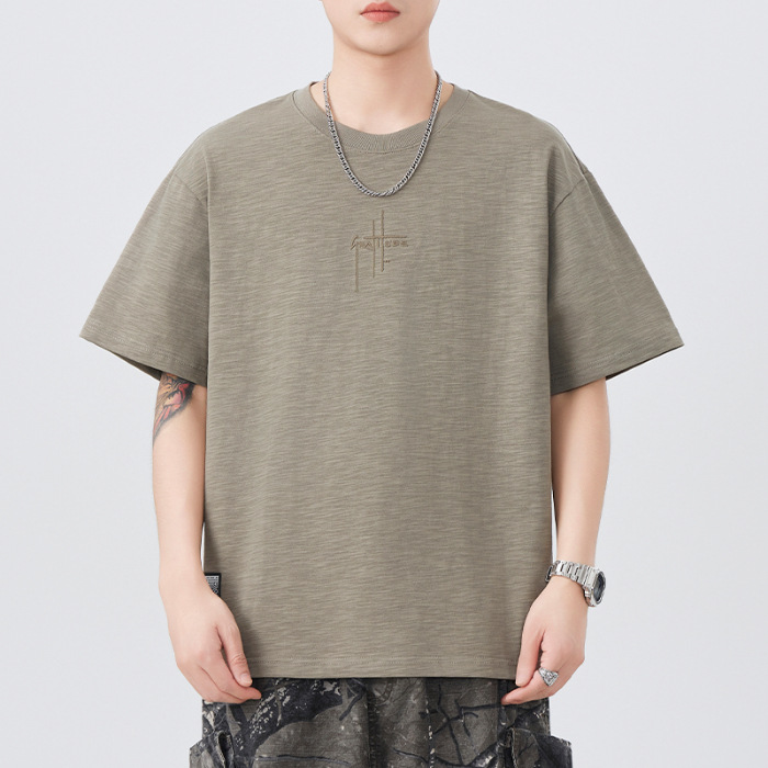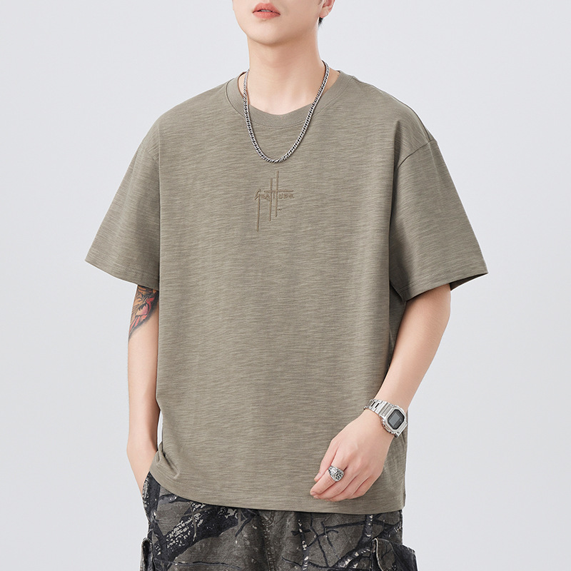 全棉字母刺绣T恤男士2025新款体恤衫宽松休闲短袖夏季卡其色上衣