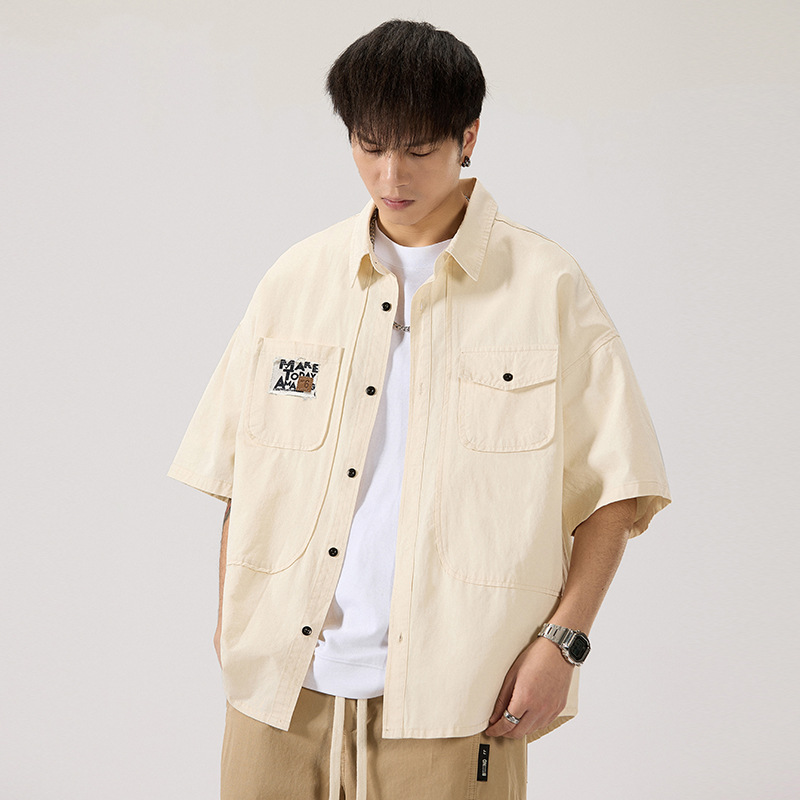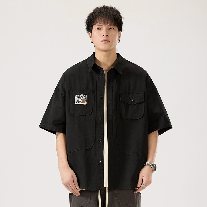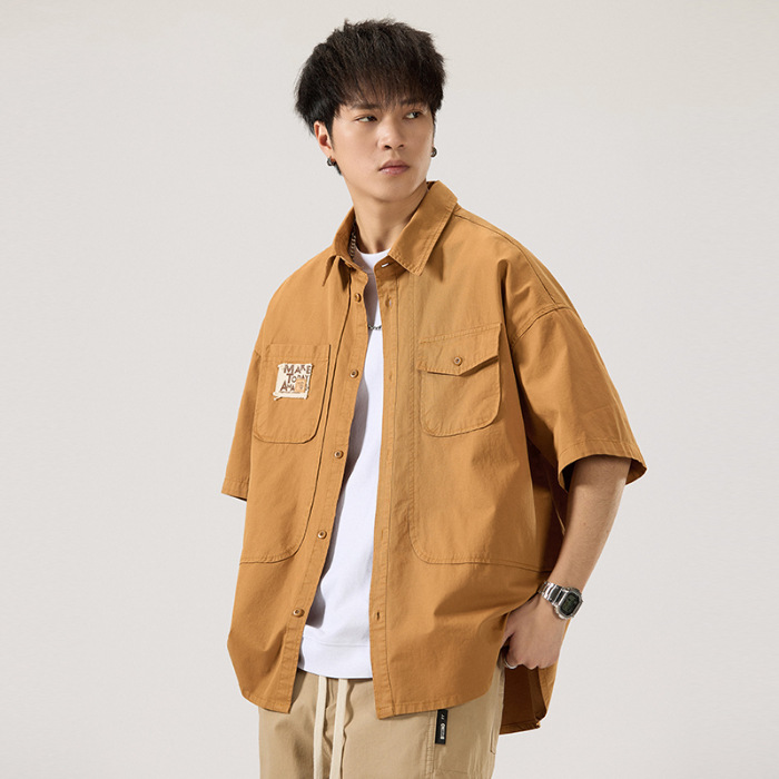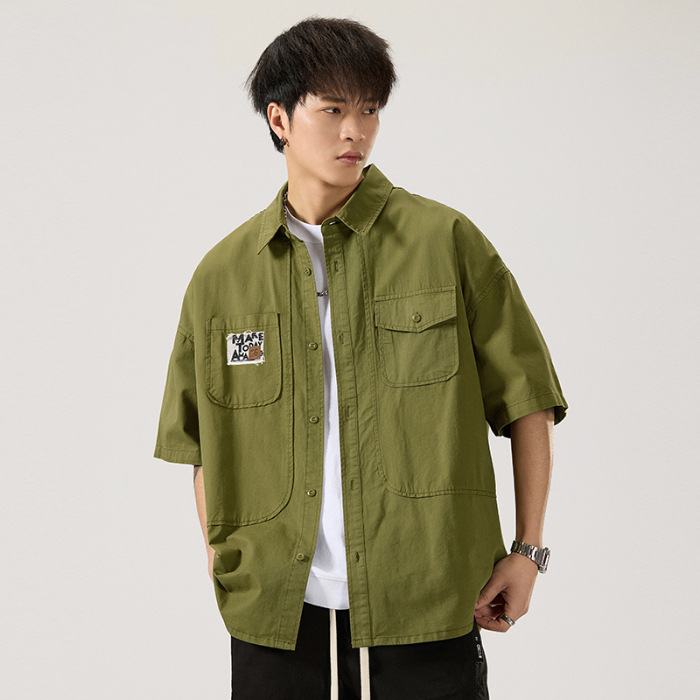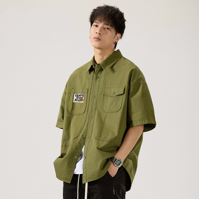 美式复古工装短袖衬衫男士夏季潮牌宽松休闲口袋机能衬衣纯棉外套