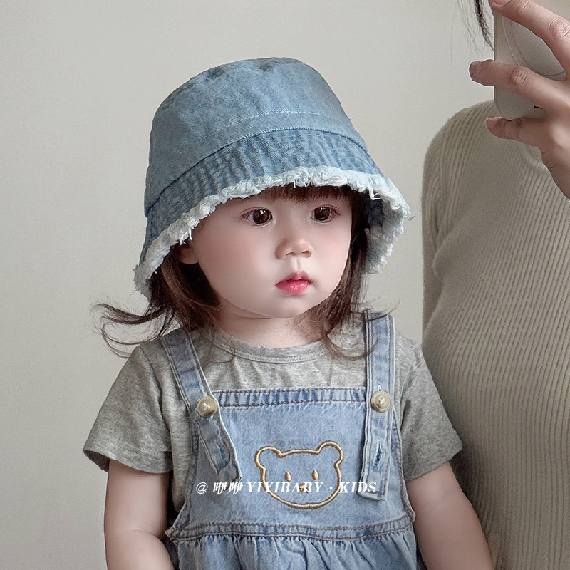 儿童帽子春秋款水洗牛仔渔夫帽男女童遮阳防晒帽宝宝大檐水桶盆帽