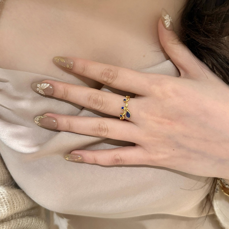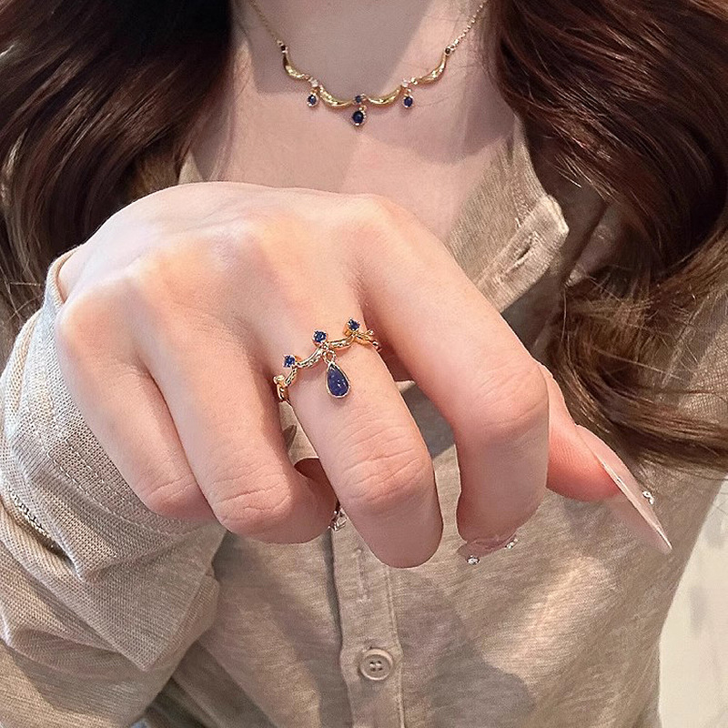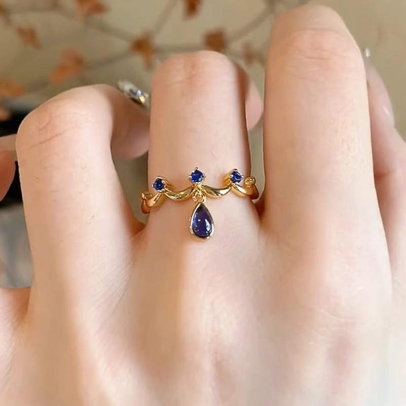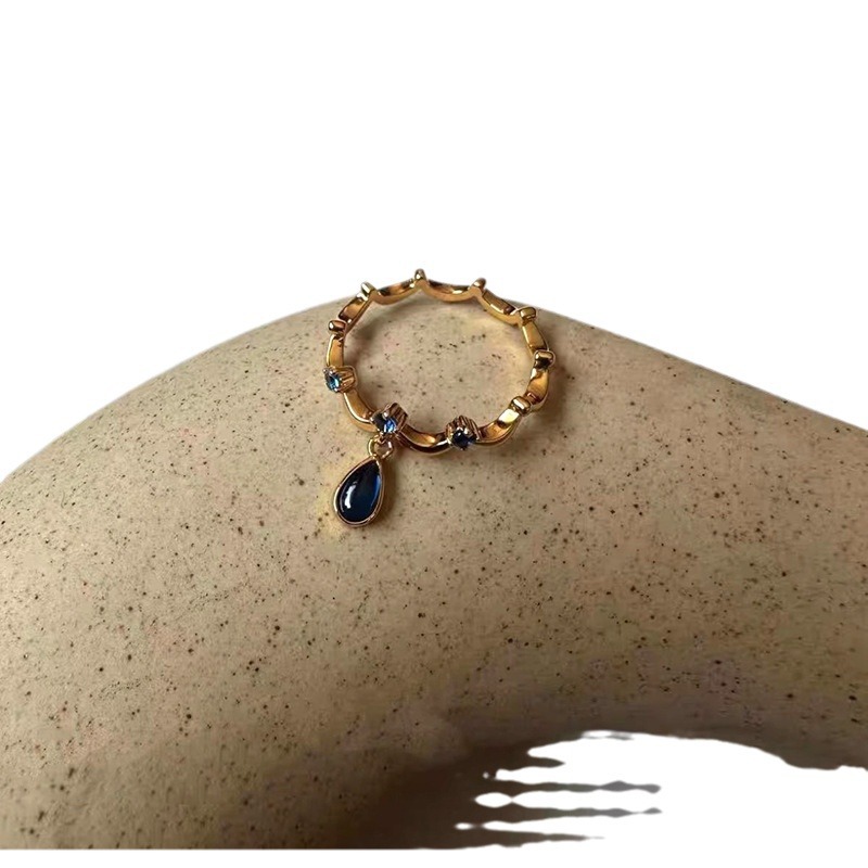 小红书爆款古法琉璃工艺花边蓝色水滴系列法式复古蓝宝石流苏戒指