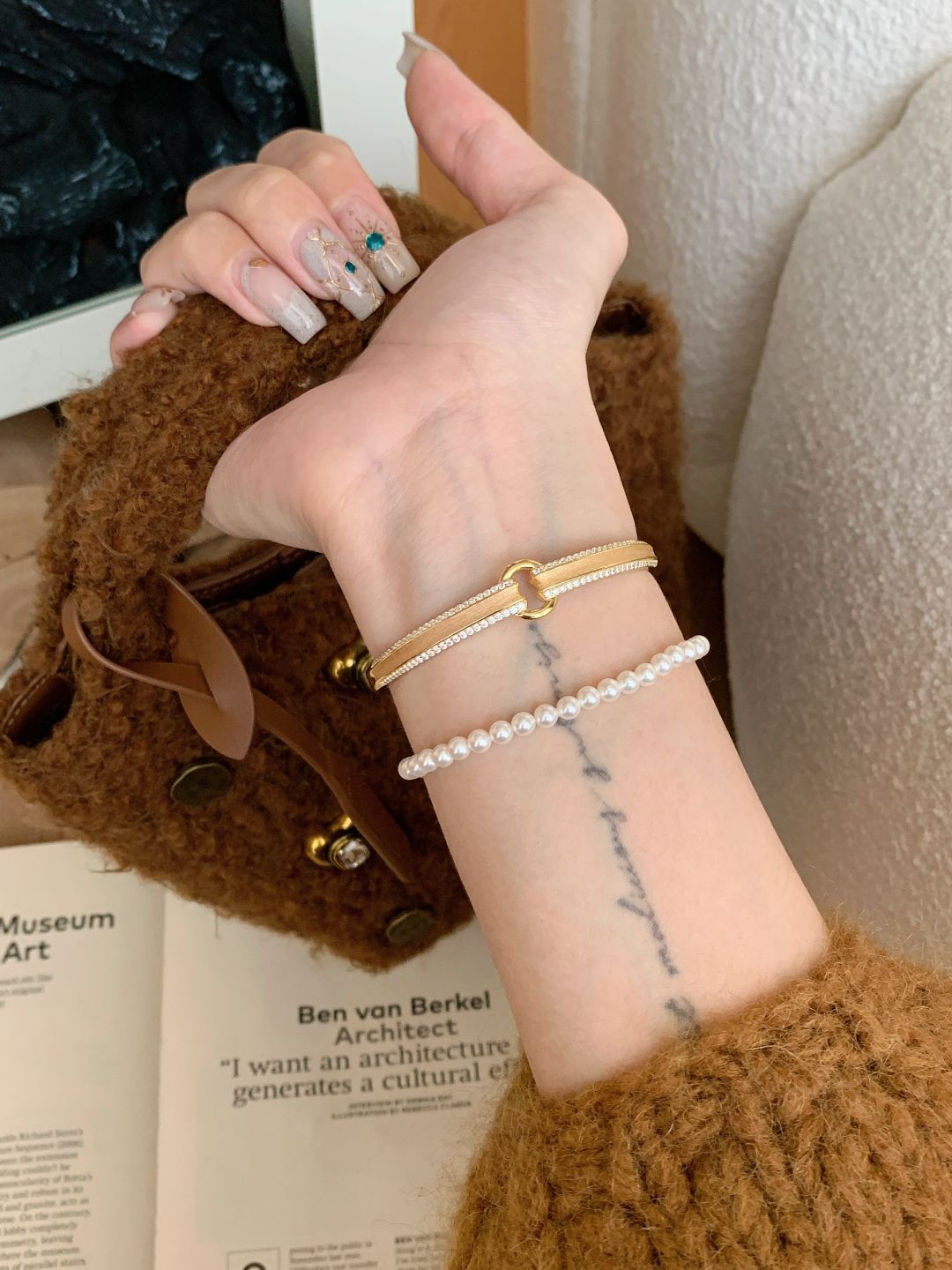 纯手工穿戴甲法式简约风线条美甲珍珠贴钻小香风秋季新款光疗甲片