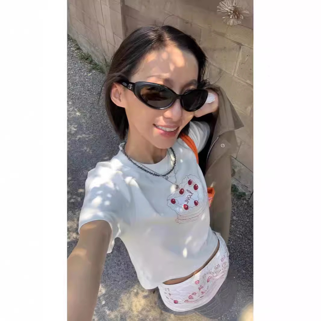 夏季正肩短袖t恤女修身短款美式复古爱心蛋糕印花百搭白色上衣潮