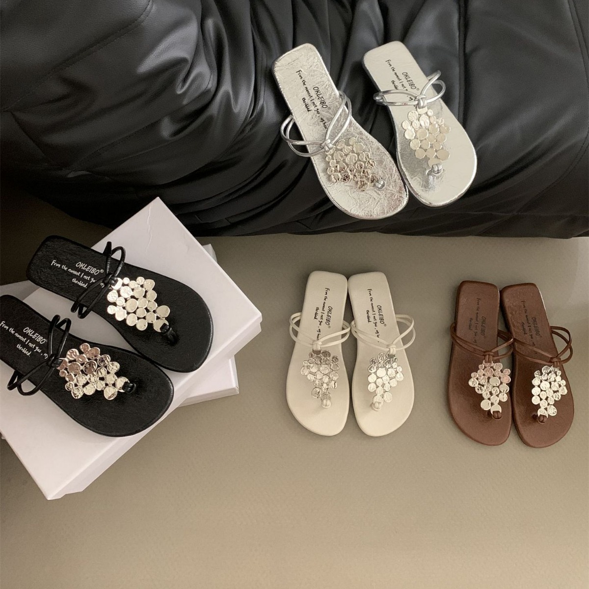 韩版小众夹趾拖鞋女夏露趾金属扣度假沙滩罗马波西米亚凉拖鞋