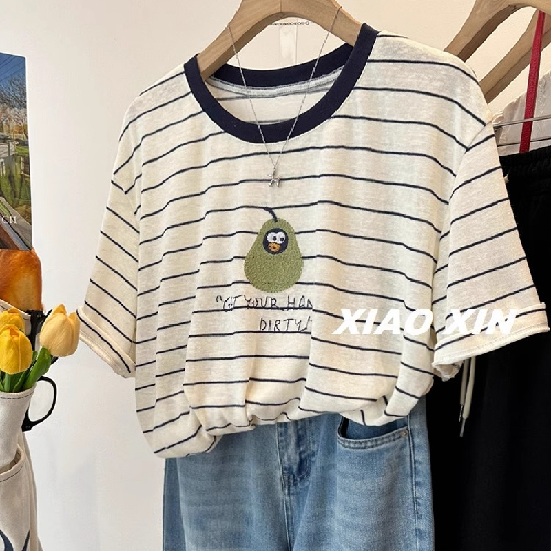 美式复古企鹅青梨印花薄款条纹短袖T恤女夏季舒适透气休闲上衣服