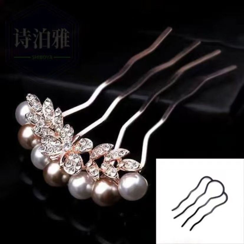 韩版珍珠四齿插梳水钻盘头蝴蝶结发梳后脑勺成人发饰
