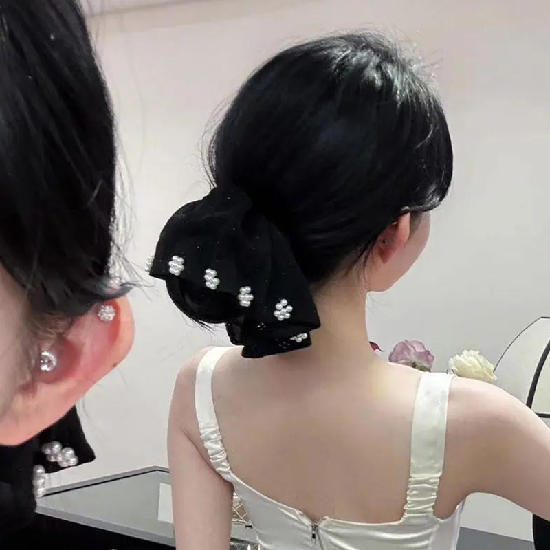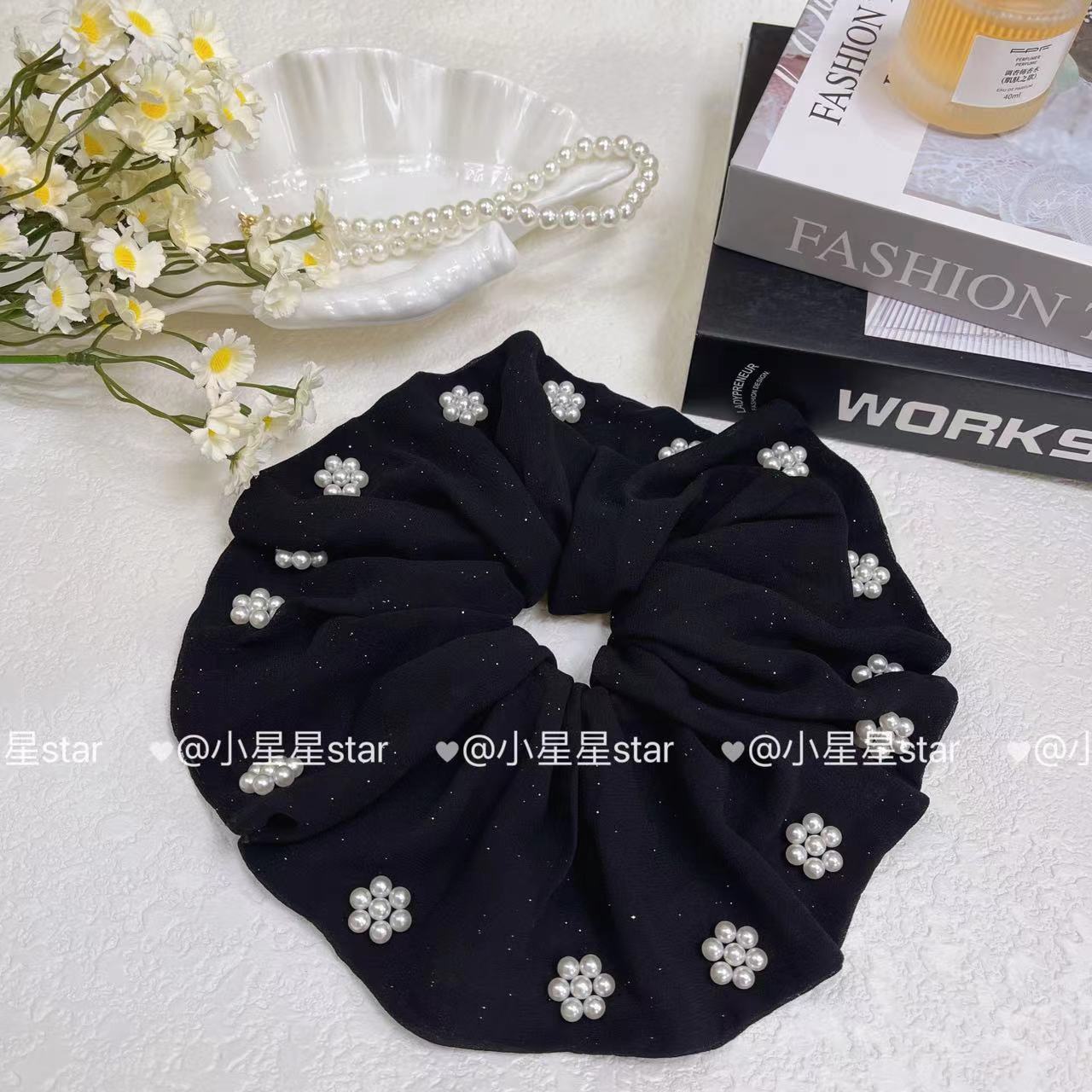 满天星河黑色头饰法式钉珠赫本风高级感气质大肠发圈珍珠花朵头绳