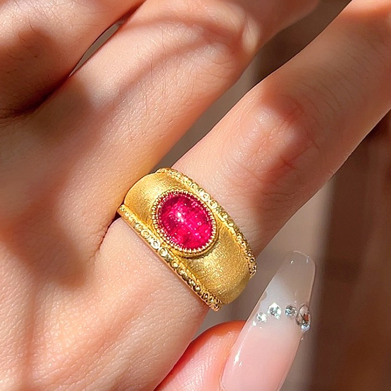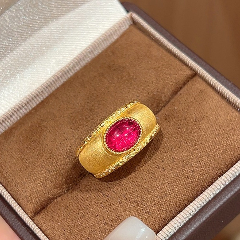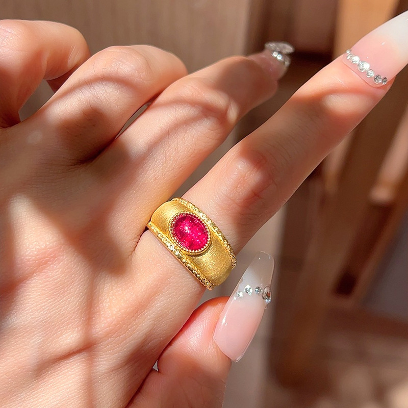 小红书爆款拉丝红宝鸽子蛋戒指女复古宫廷风宽版精致指环
