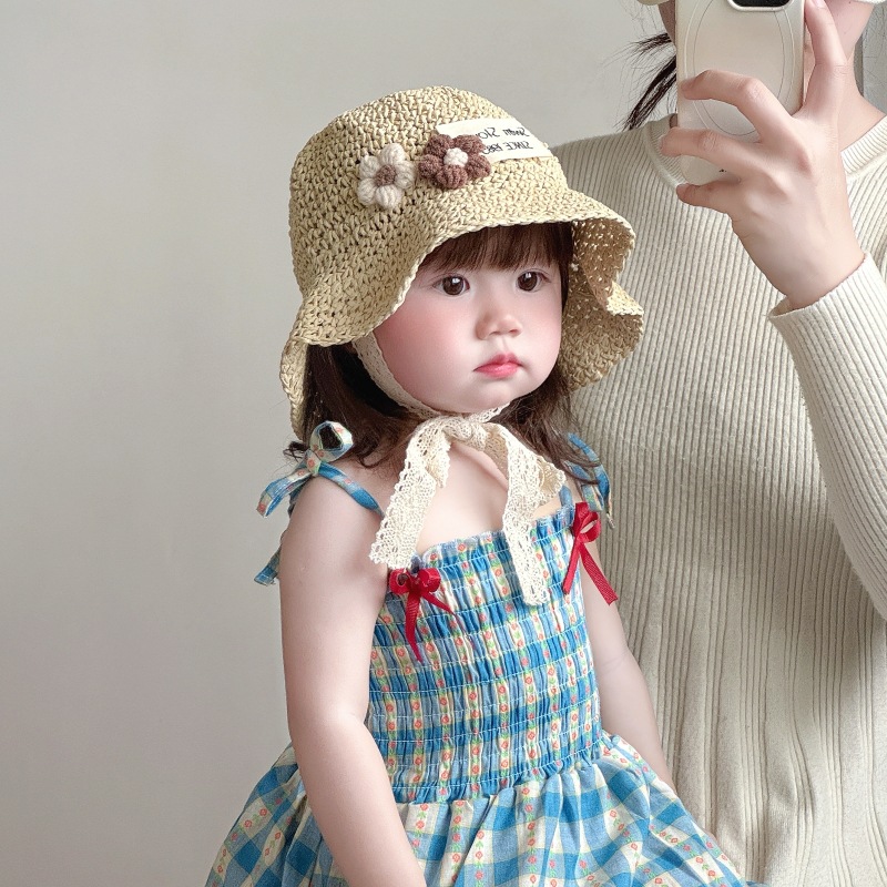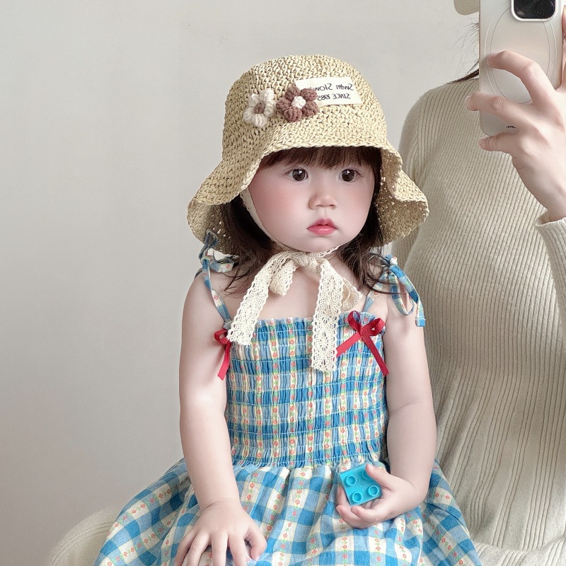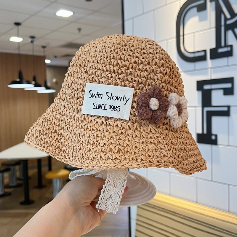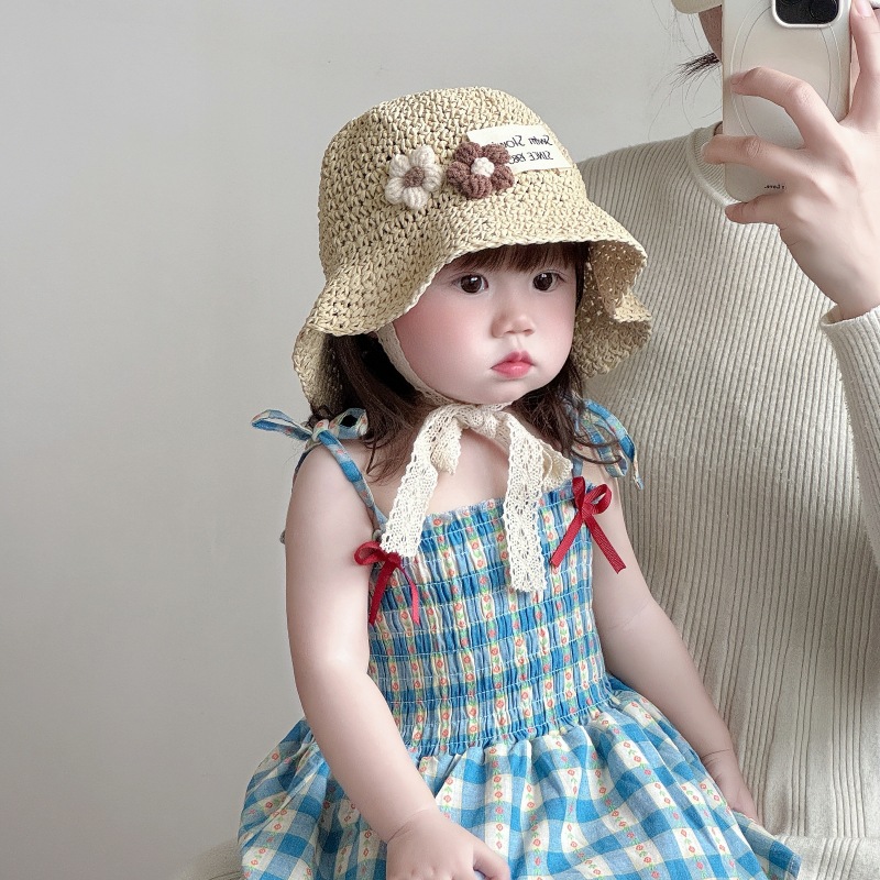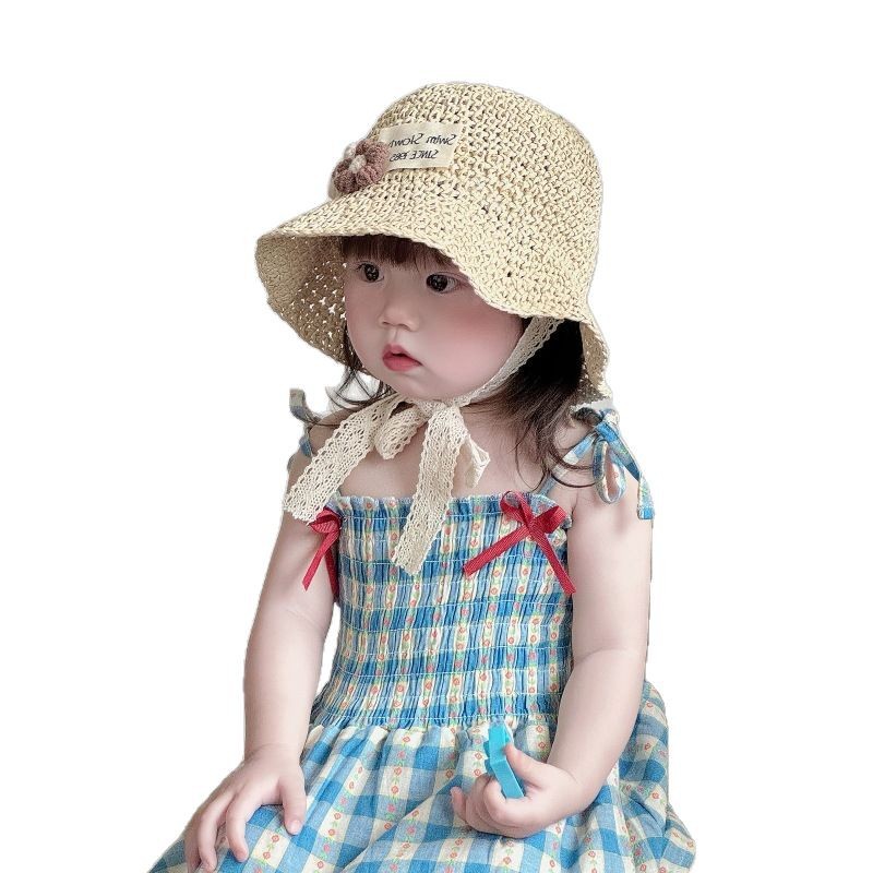 儿童草帽夏季贴标花朵女童防晒帽大帽檐婴儿遮阳帽百搭宝宝渔夫帽