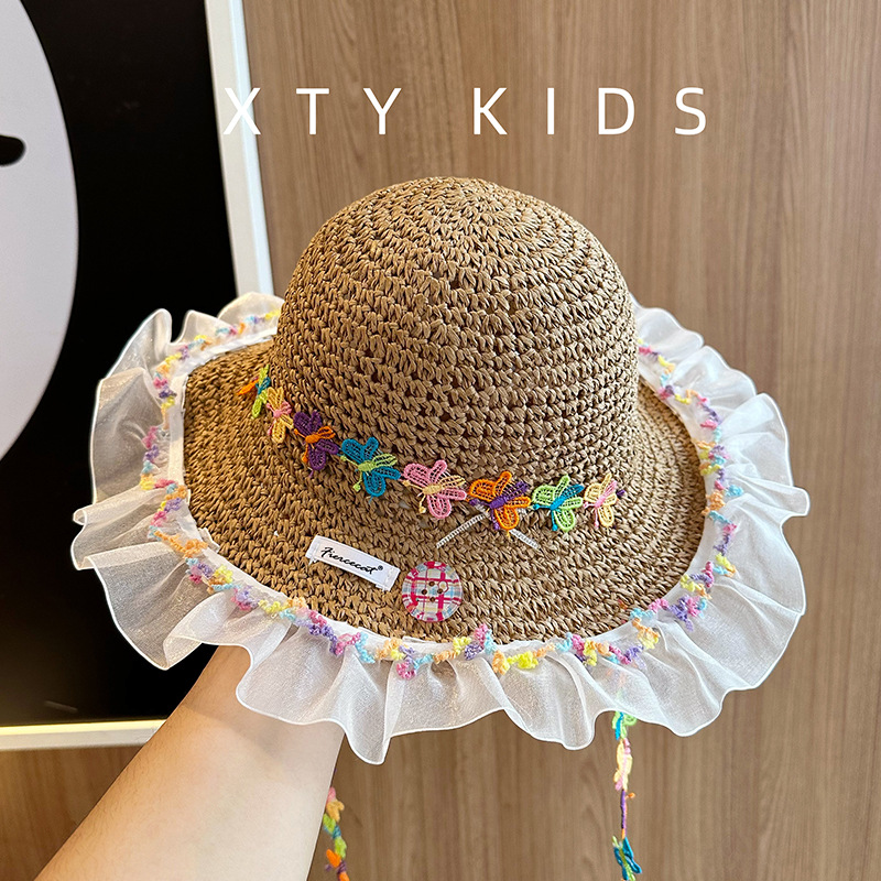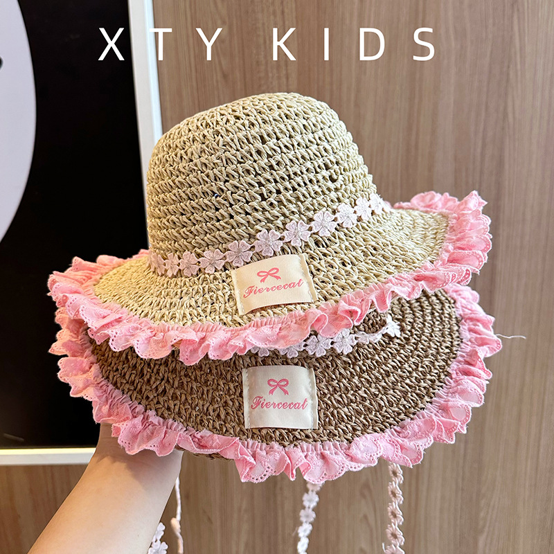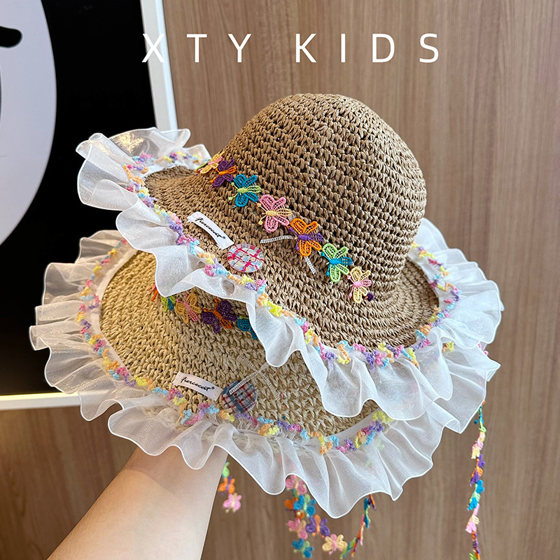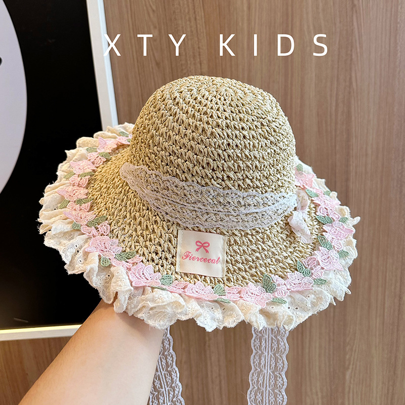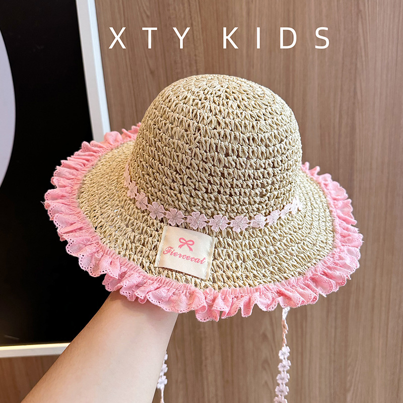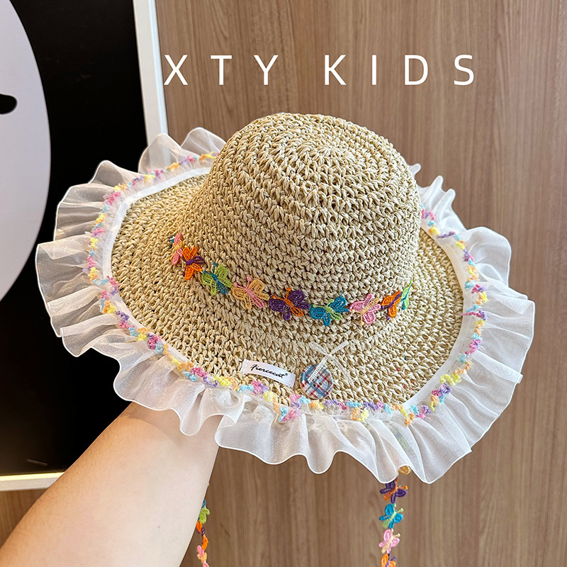 儿童帽子夏季草编大帽檐渔夫帽女公主出游沙滩遮阳防晒宝宝太阳帽
