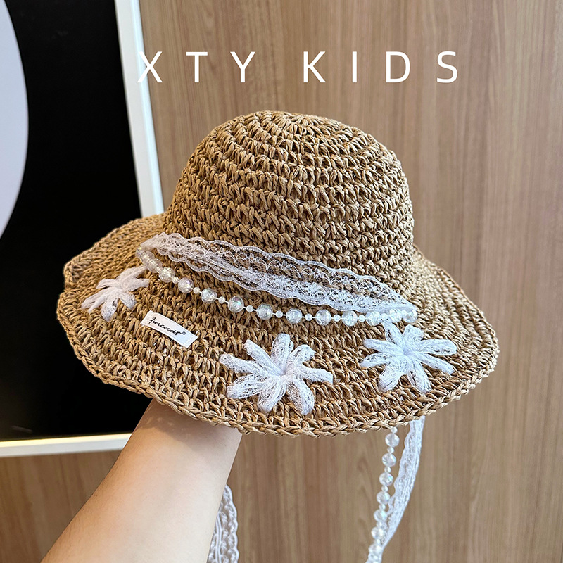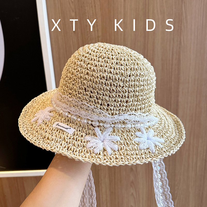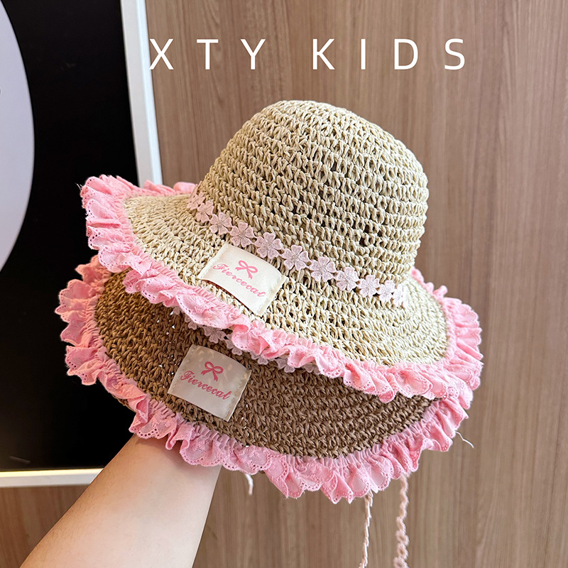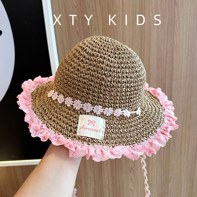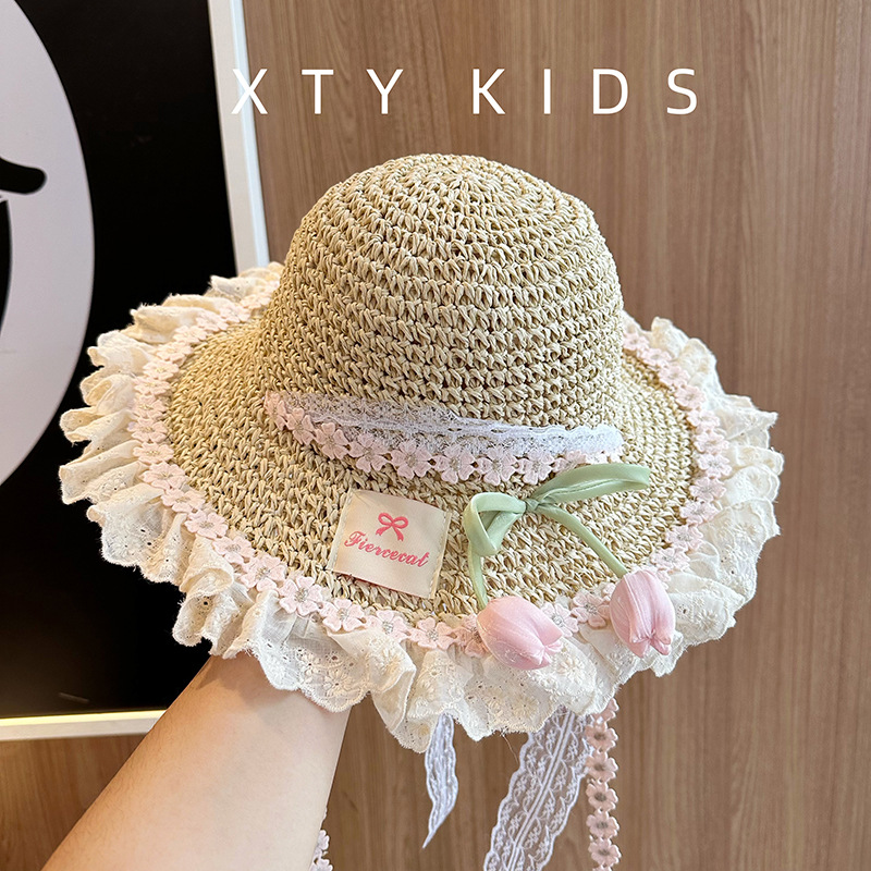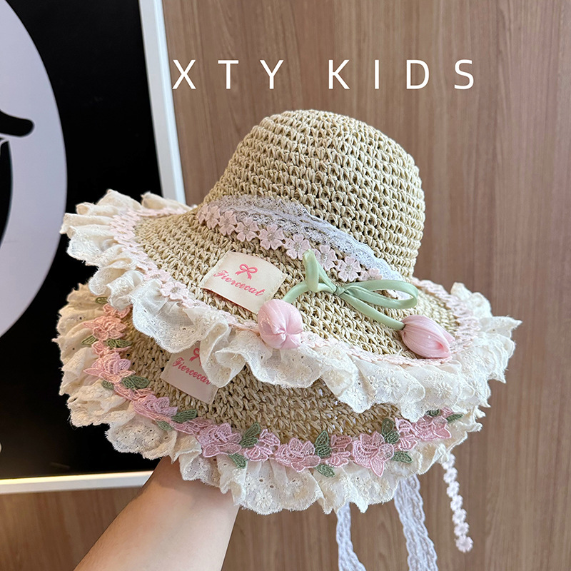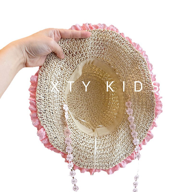 儿童帽子夏季草编大帽檐渔夫帽女公主出游沙滩遮阳防晒宝宝太阳帽