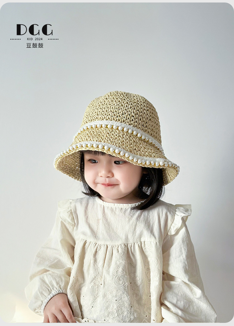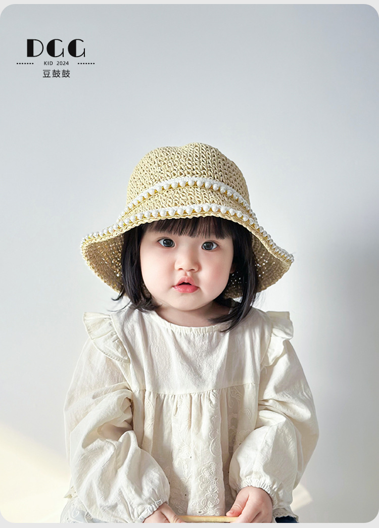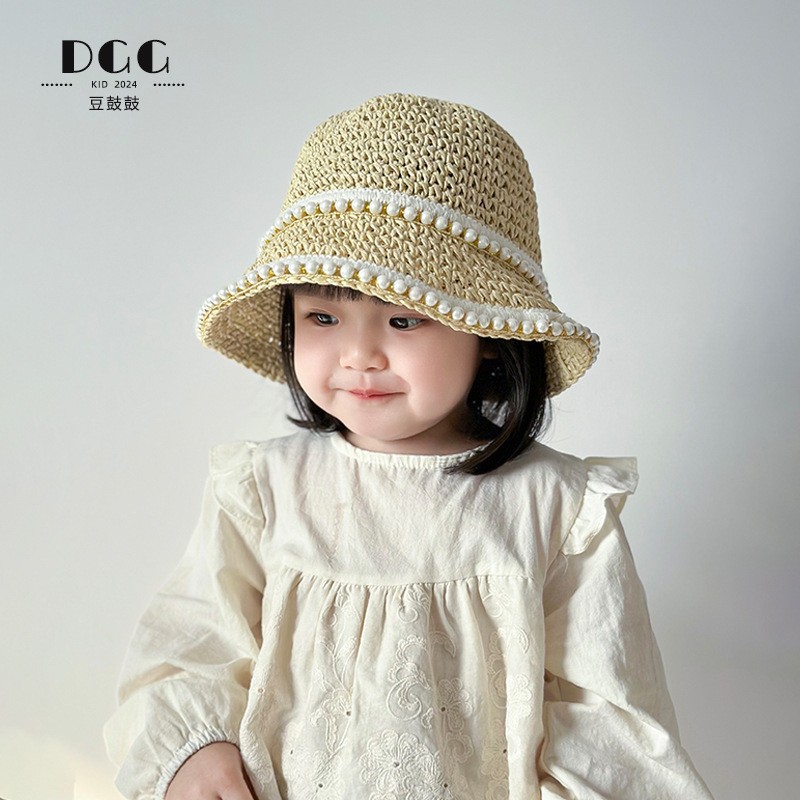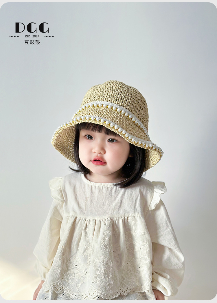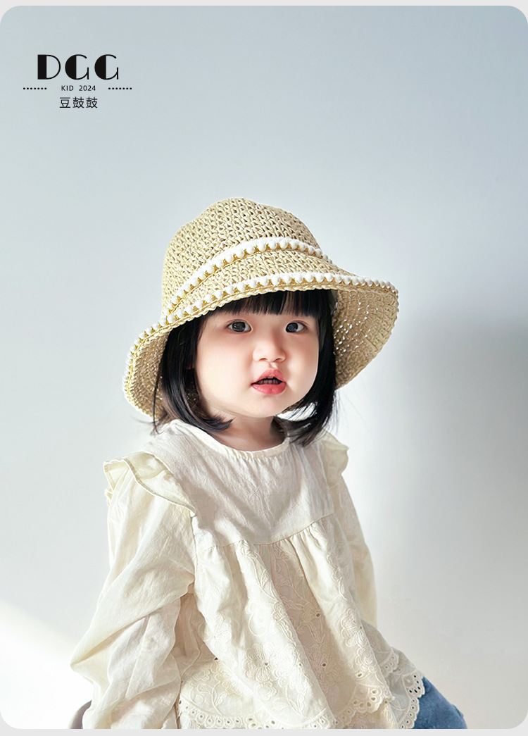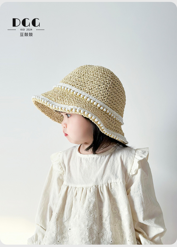 儿童草帽夏季遮阳防晒手工珍珠帽子女童韩版公主可折叠沙滩渔夫帽