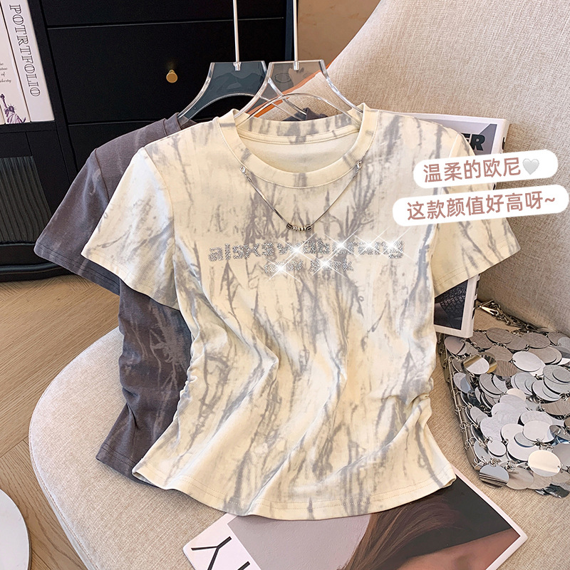 短款T恤女短袖夏季设计感小众扎染烫钻高腰修身小个子正肩上衣ins