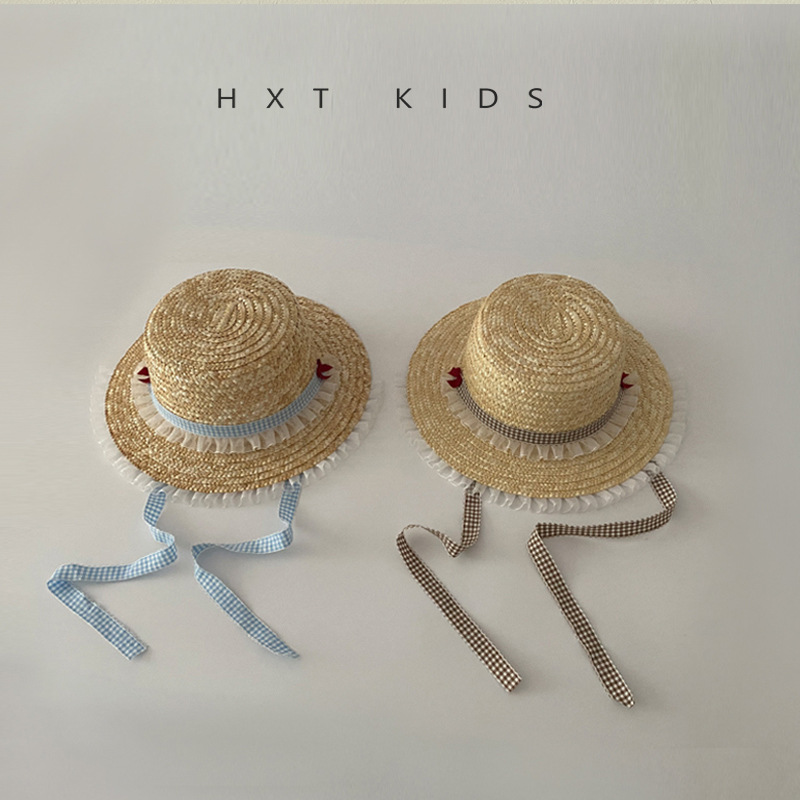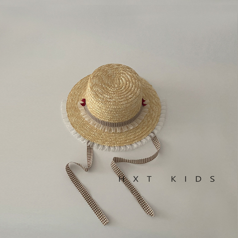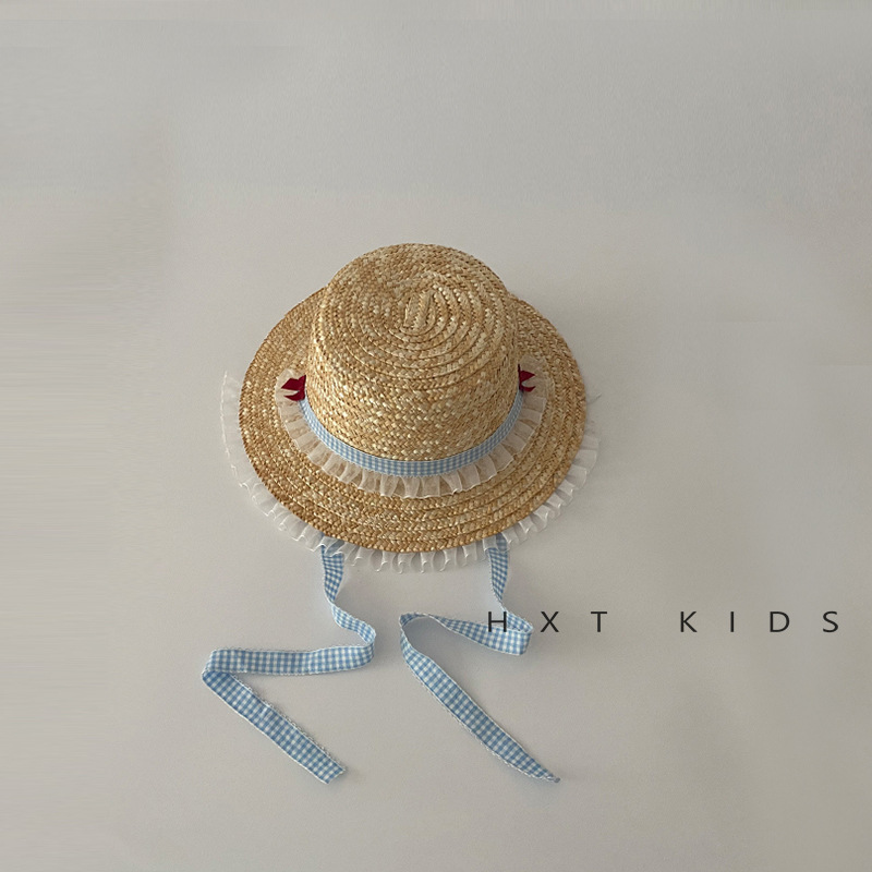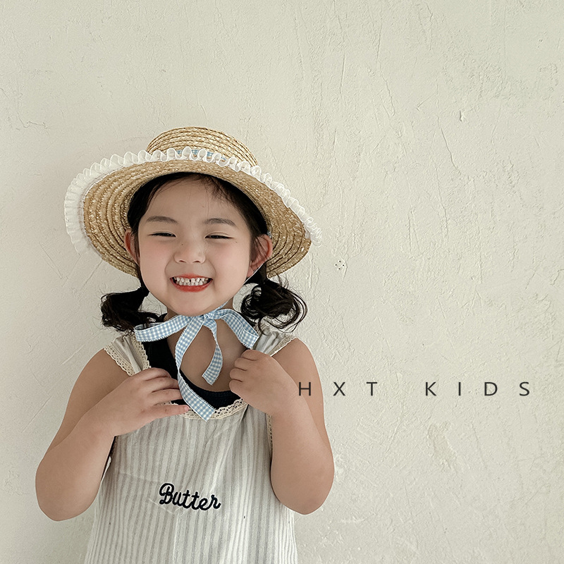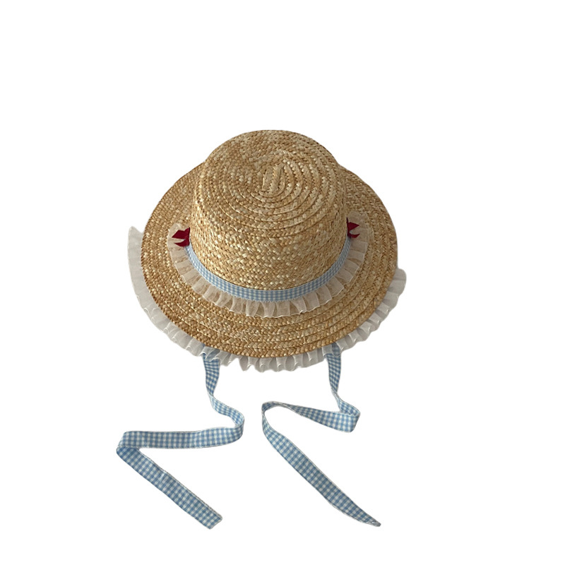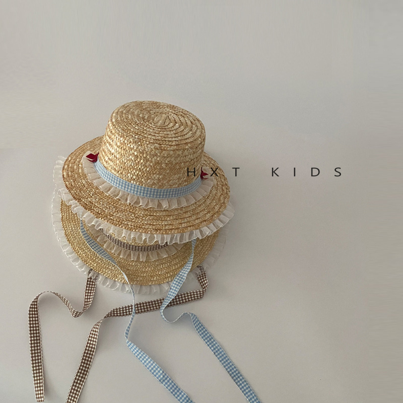 儿童大帽檐草帽夏洋气蕾丝花边手工编织麦秆帽子女宝宝海边防晒帽