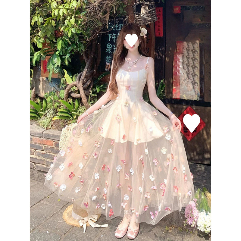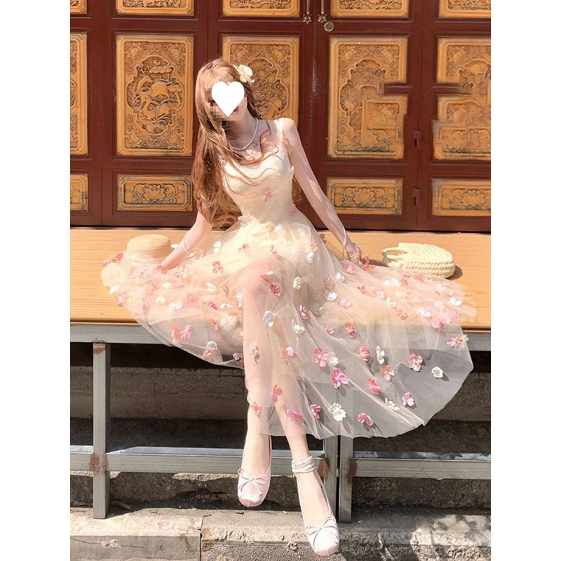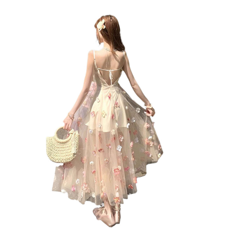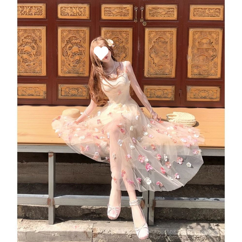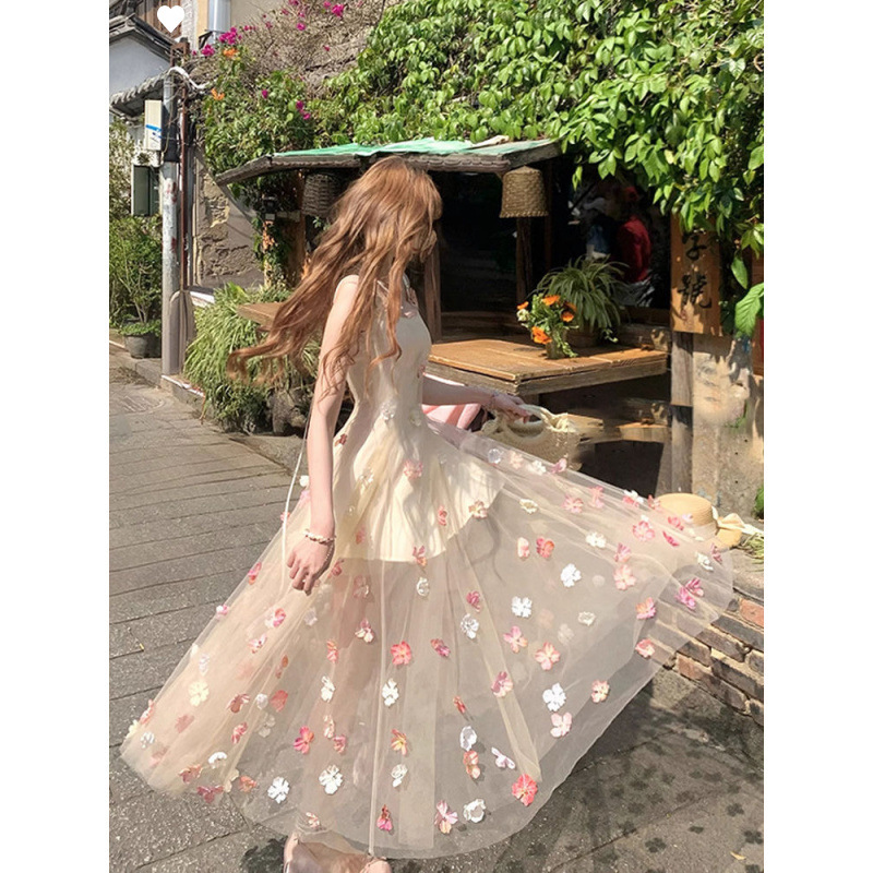 莫奈花园 夏季新款法式温柔设计感气质立体仙女花朵无袖连衣裙子