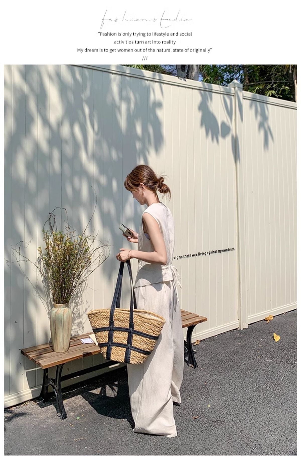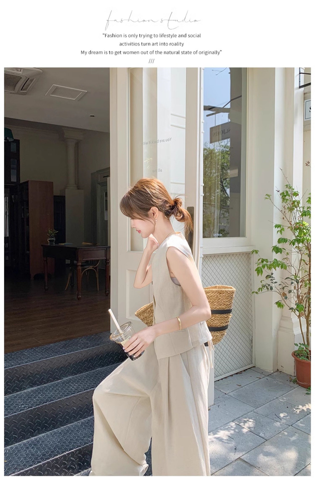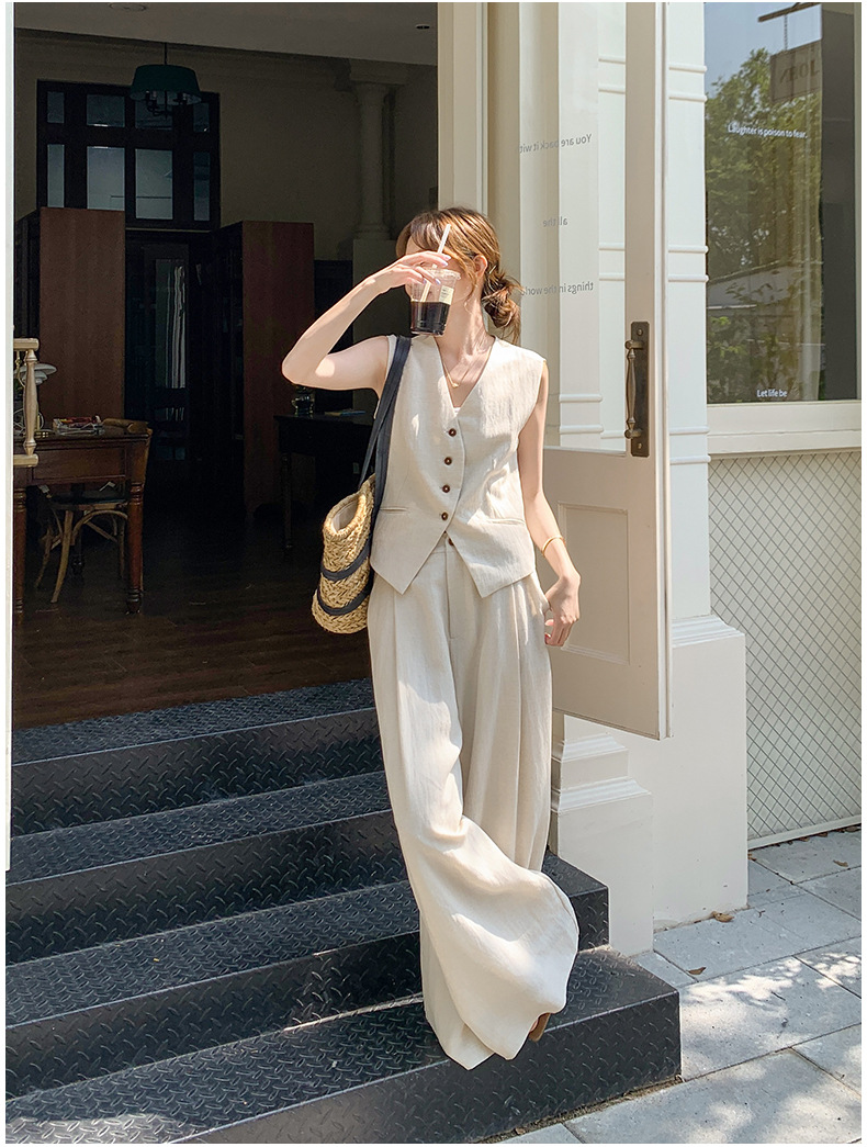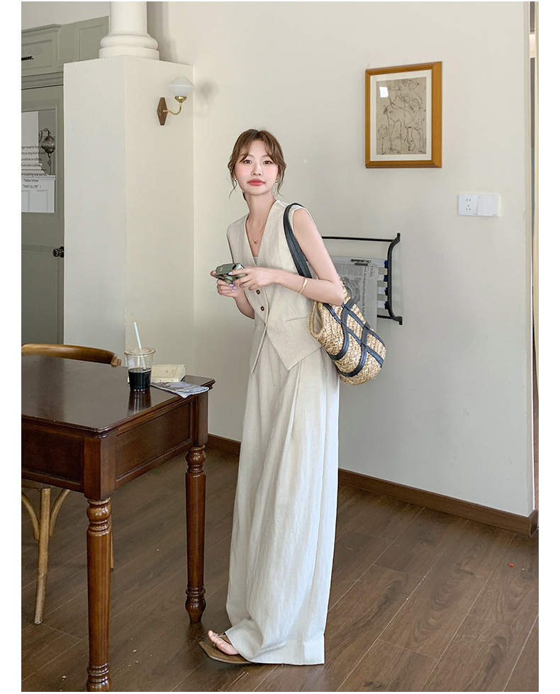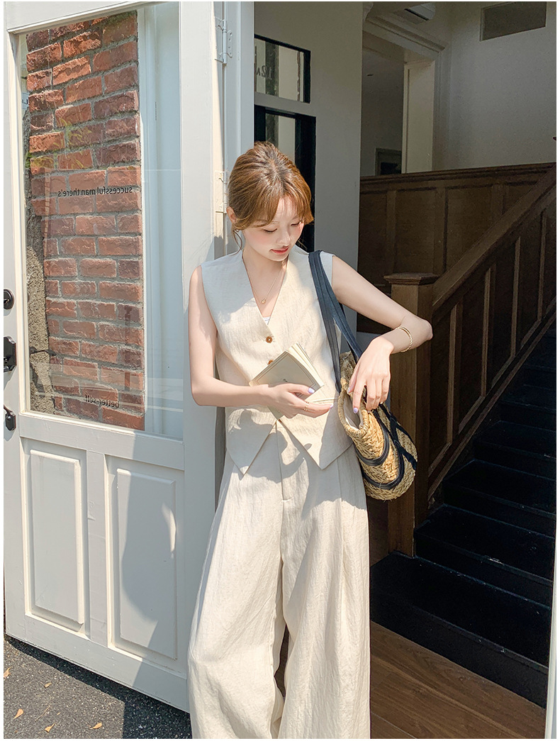 张贝贝ibell亚麻天丝老钱风设计感V领马甲+高腰阔腿休闲裤两件套