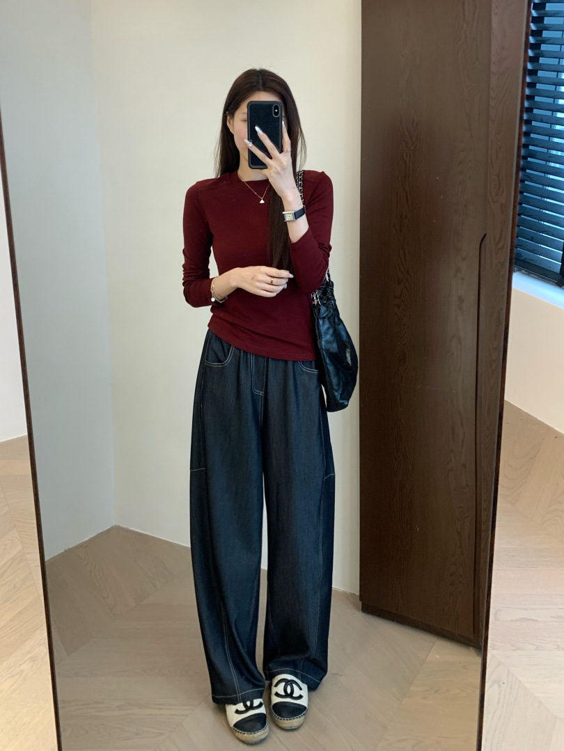 慵懒老钱感的牛仔风tr弯刀茧型阔腿裤,