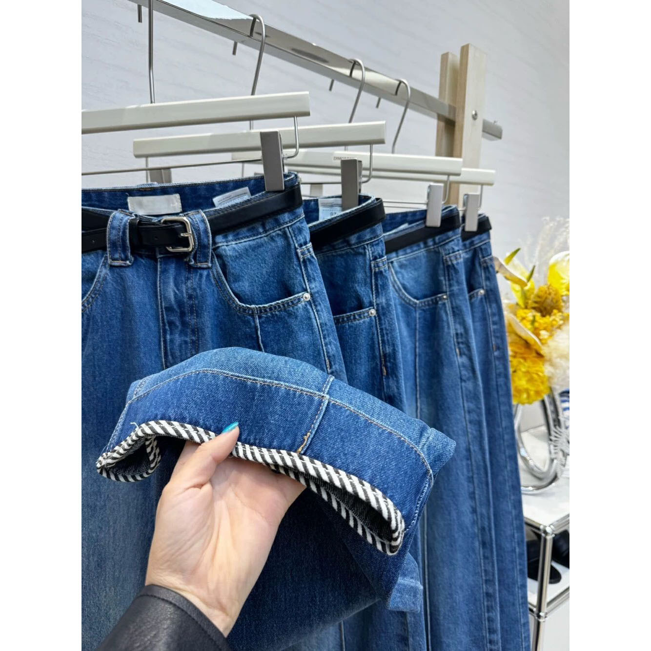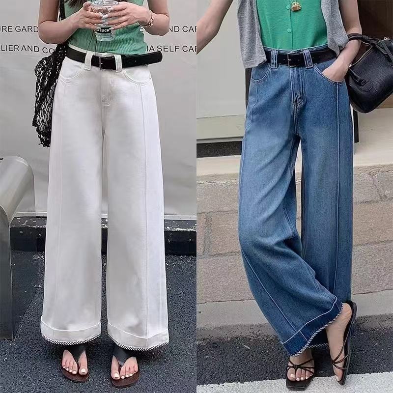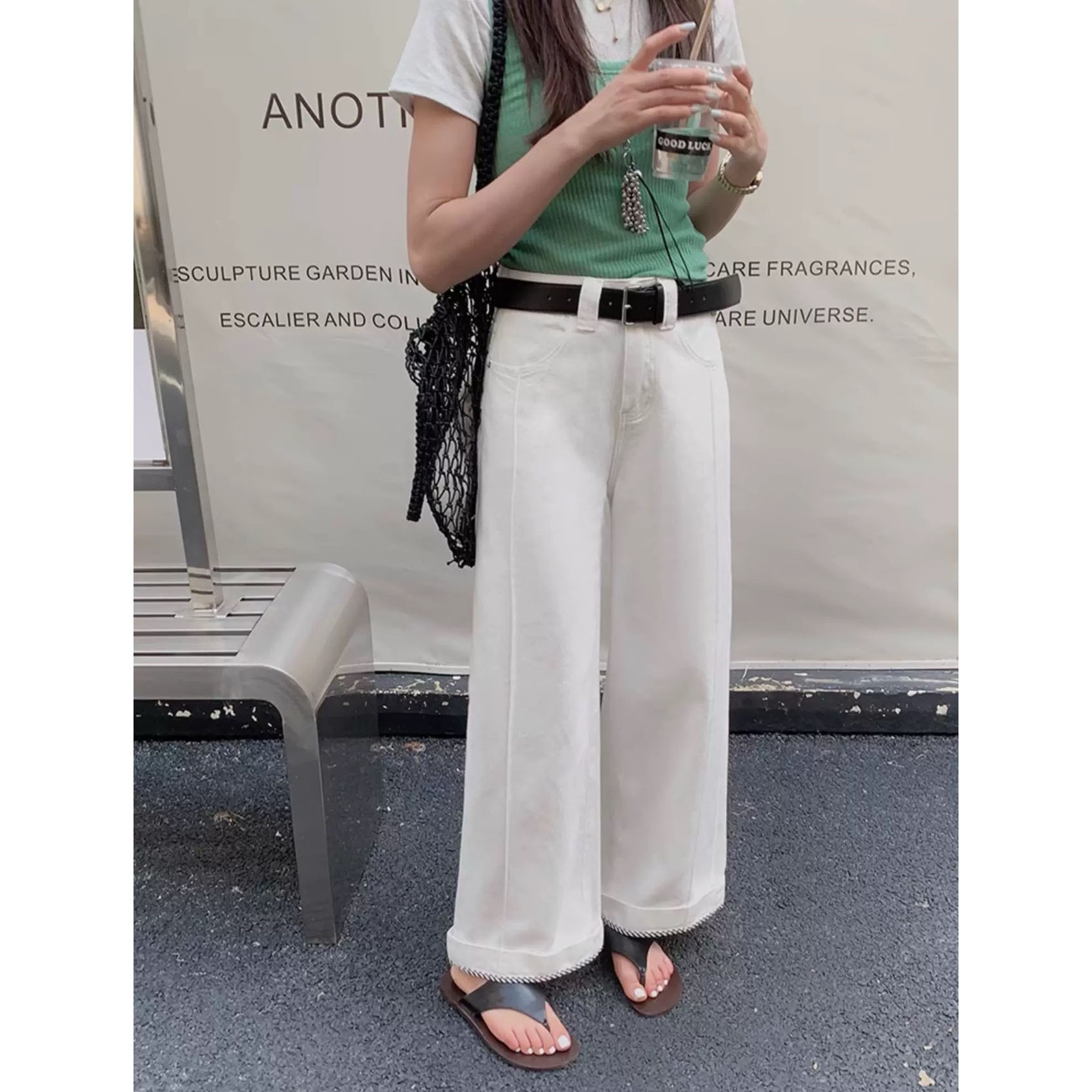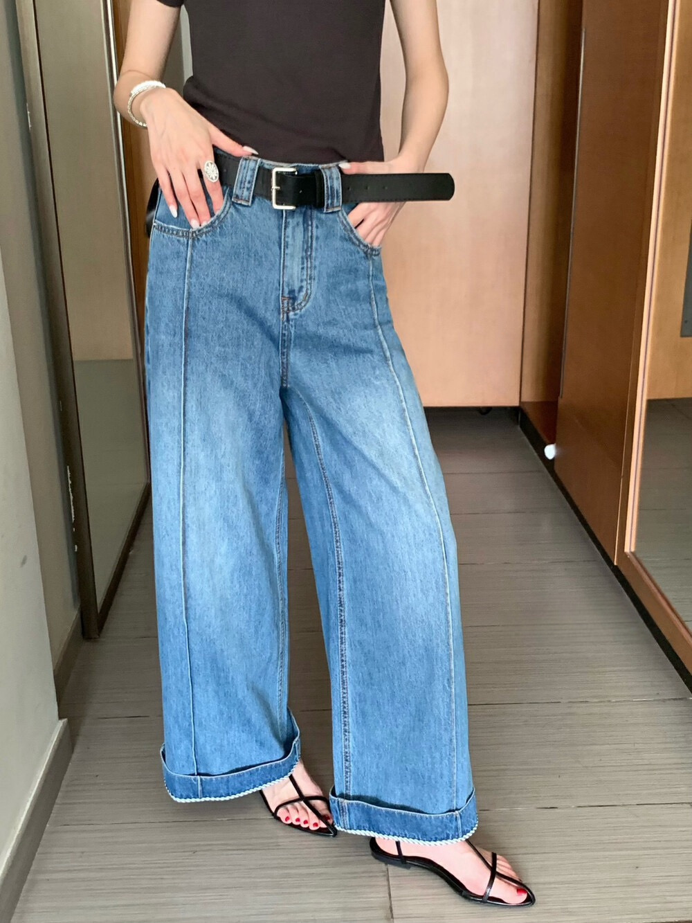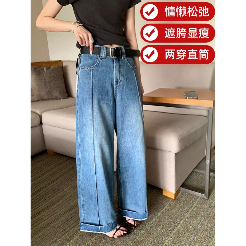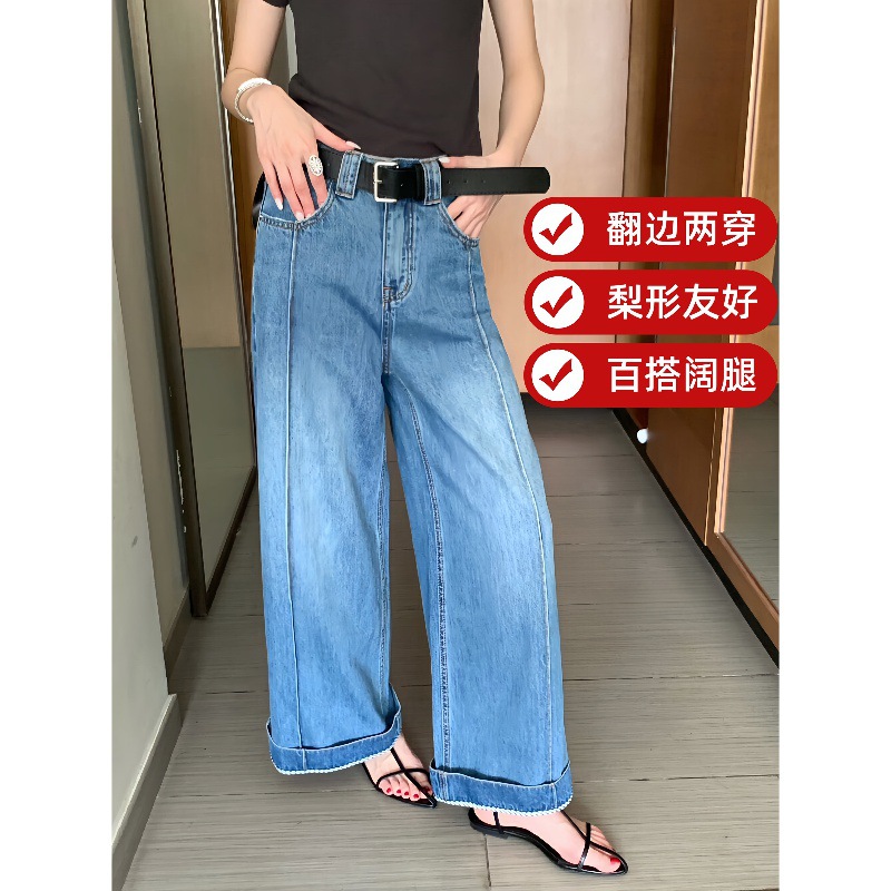 高腰阔腿牛仔裤女2025春夏薄款宽松显瘦休闲九分直筒裤子两穿设计