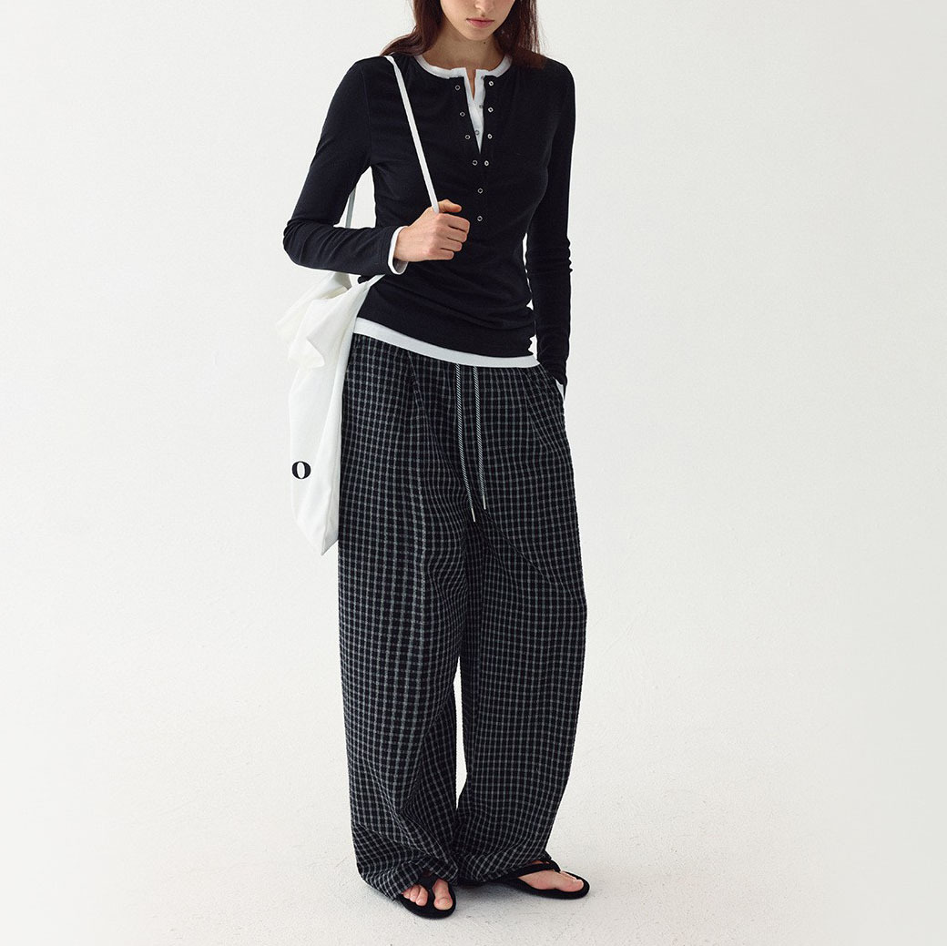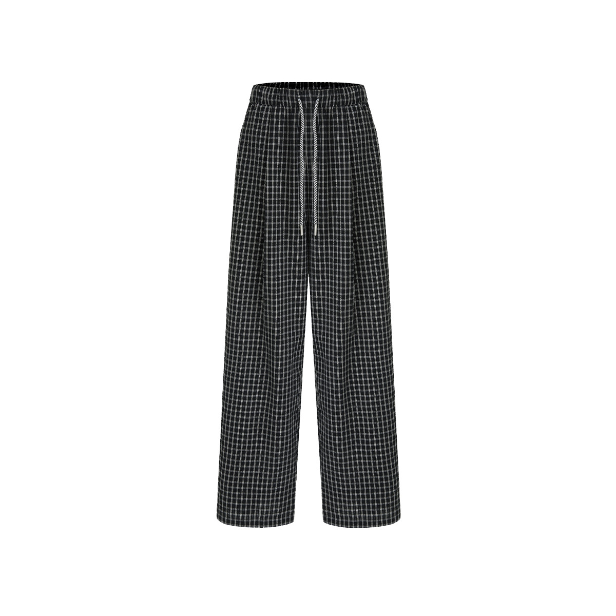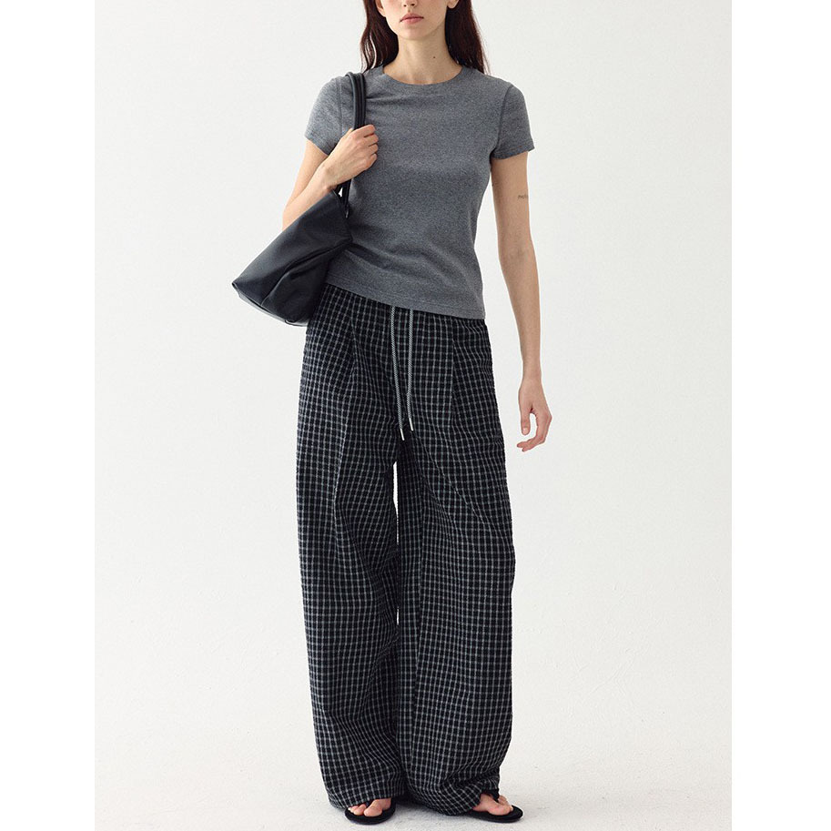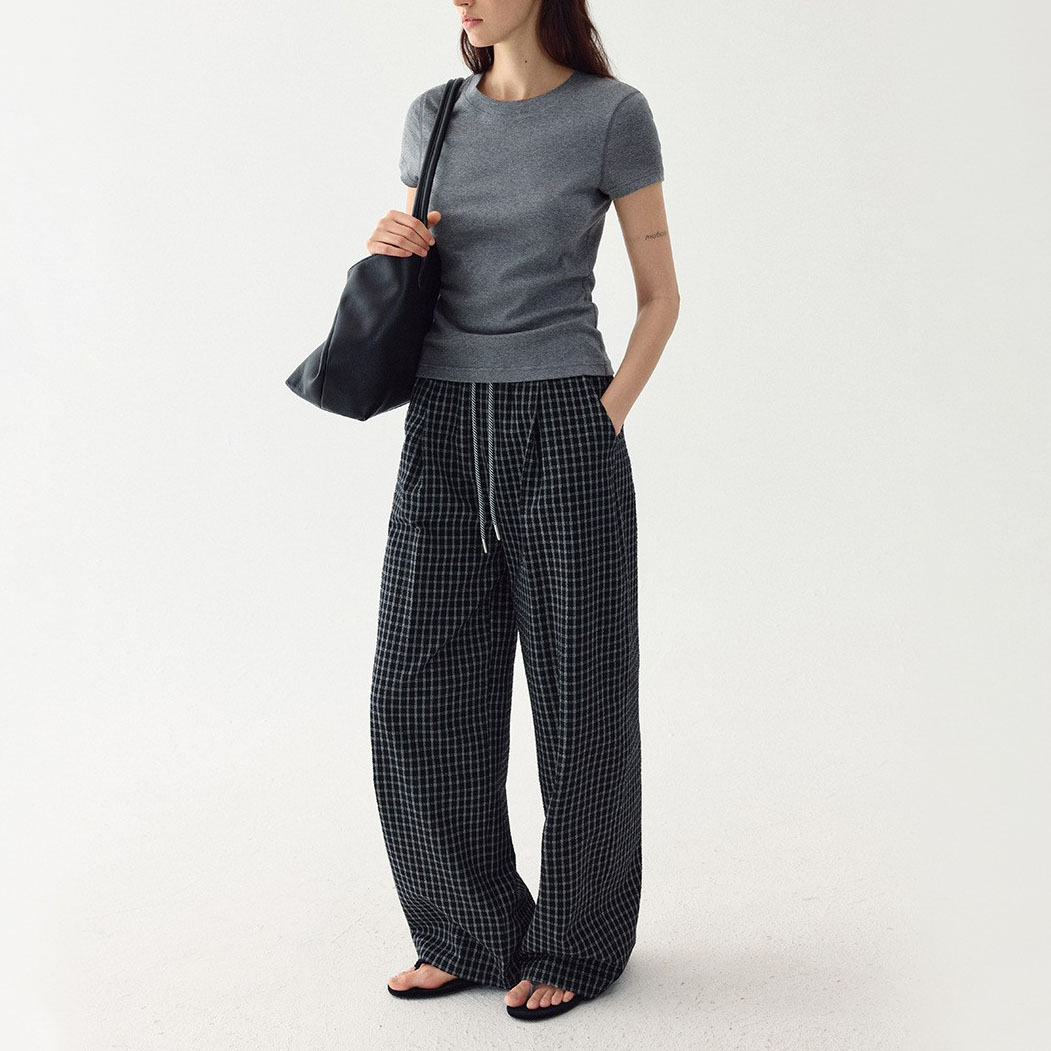 松弛氛围感立体泡泡棉格纹斜条裤绳松紧腰休闲裤女春季