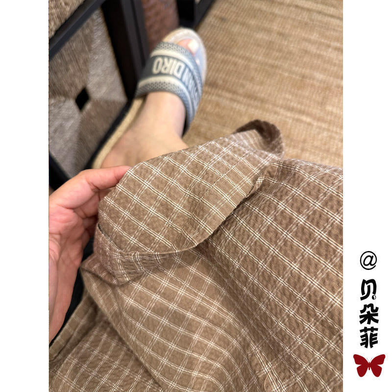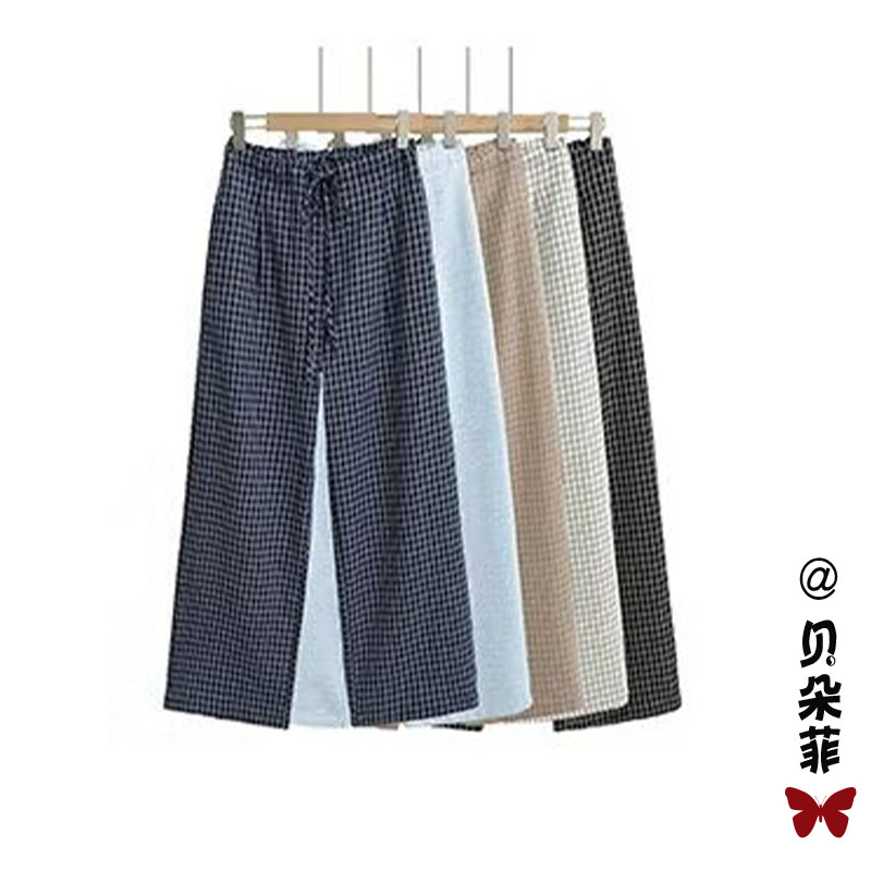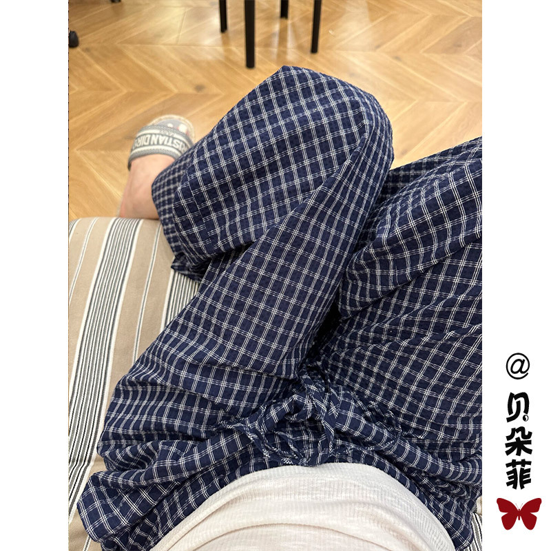 美式复古蓝色格纹阔腿休闲裤女夏季新款低腰宽松裤子运动长裤