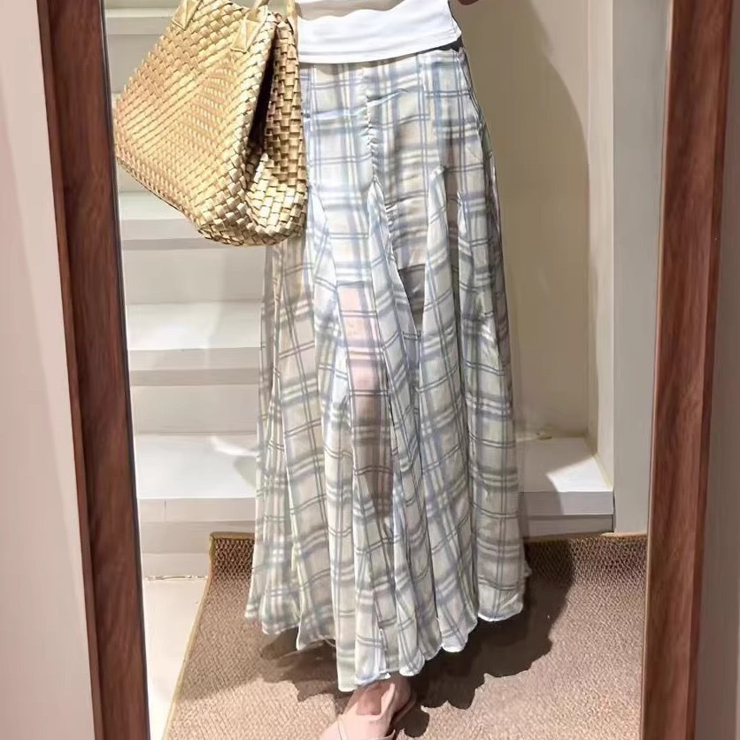 巨显瘦~夏 日系不小众规则格子裙鱼尾裙微透网纱飘逸温柔半身长裙