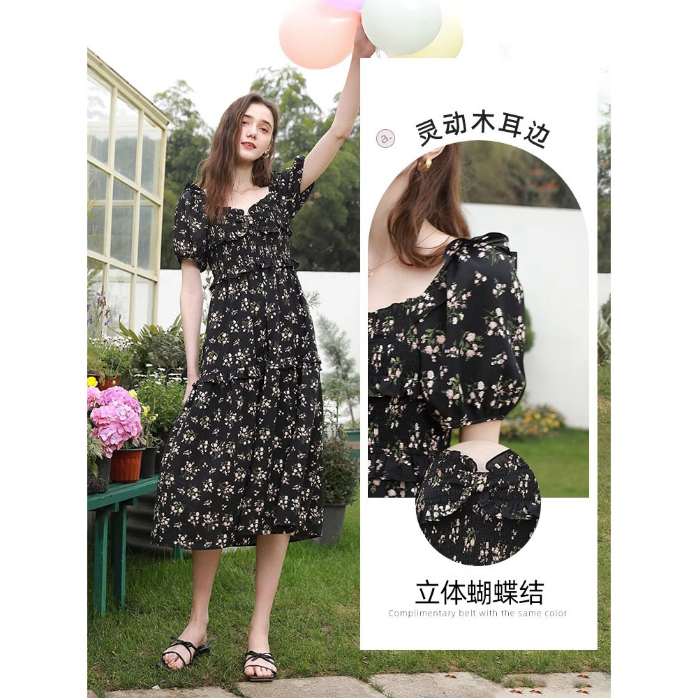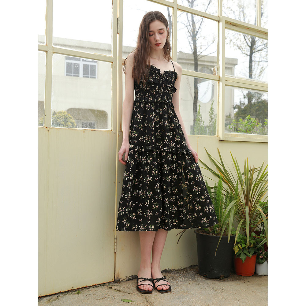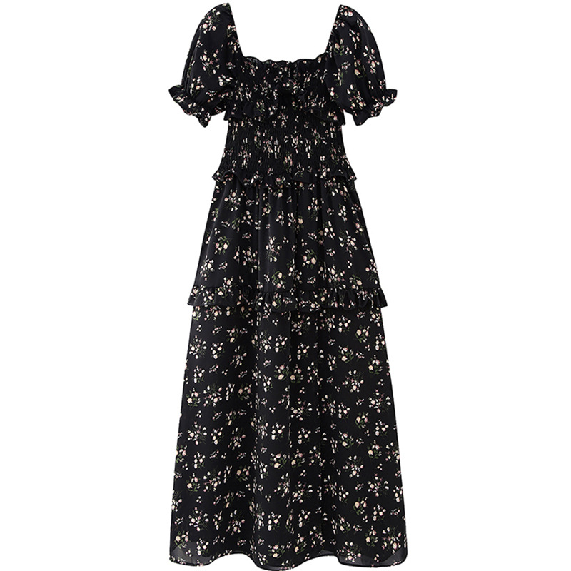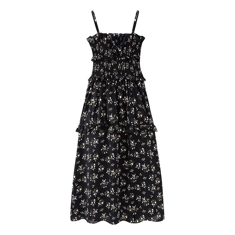 夏季新款黑色碎花吊带裙一字肩雪纺连衣裙显瘦中长裙子女