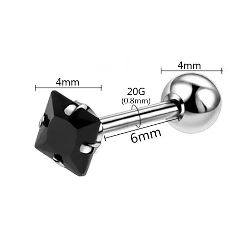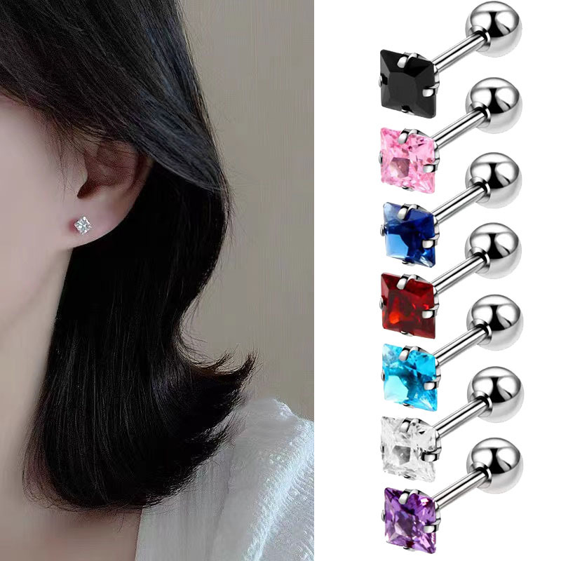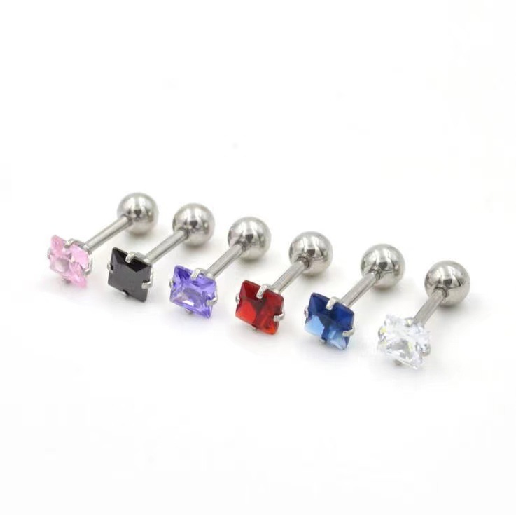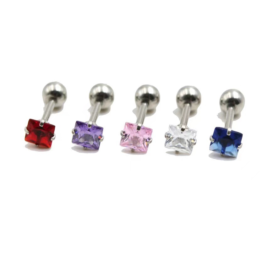 20G不锈钢四爪方形锆石耳钉多色AAA级4mm几何锆石耳饰小耳骨钉