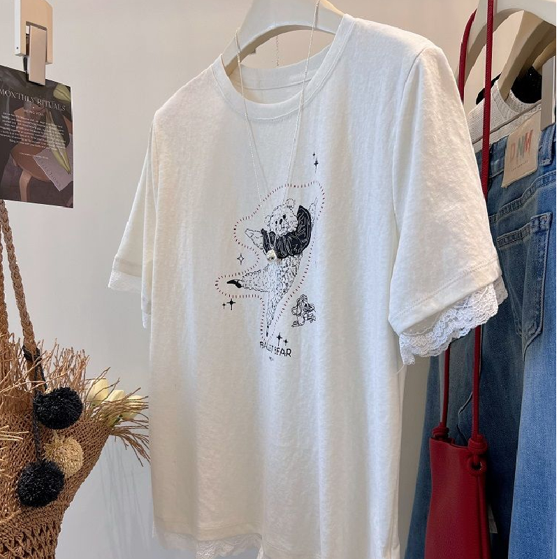 时尚简约跳舞小熊印花拼蕾丝花边短袖t恤女夏季凉爽舒适宽松上衣