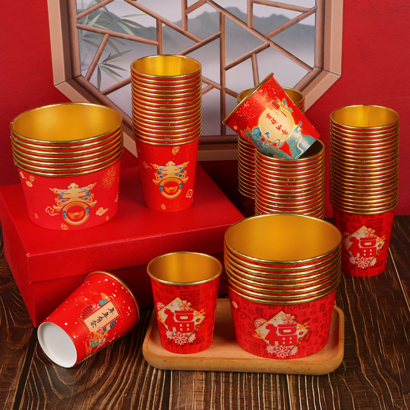 2025新年纸杯蛇年一次性纸碗春节贺岁金箔加厚福字纸碗红色纸杯子