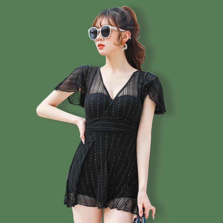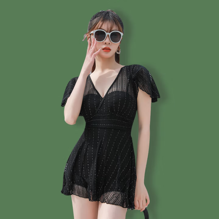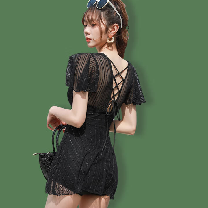 女士泳衣女蕾丝镂空绑带连体裙式沙滩度假泡温泉款休闲泳衣