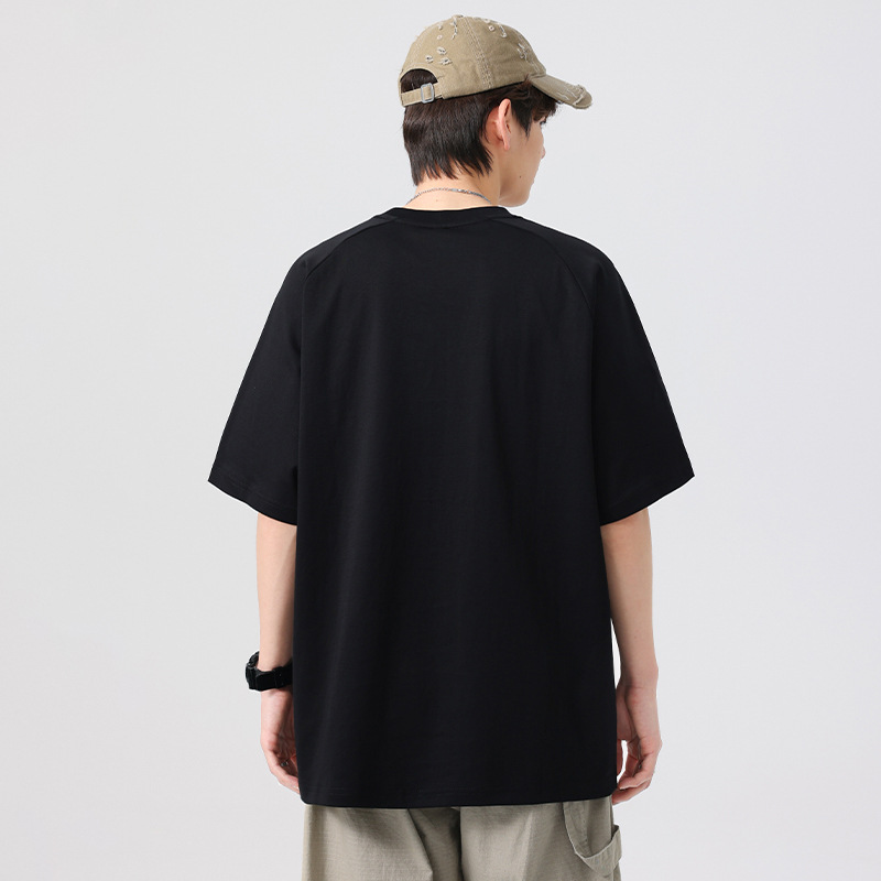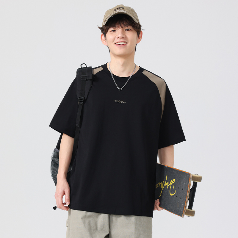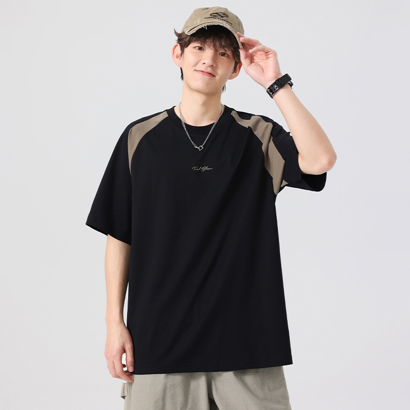夏季黑灰色男士短袖t恤衫宽松潮牌拼色插肩高级感半袖体恤衫上衣