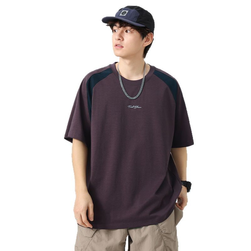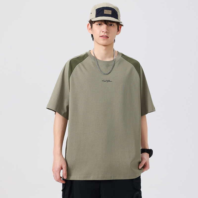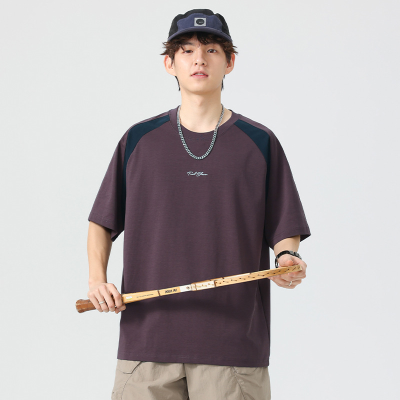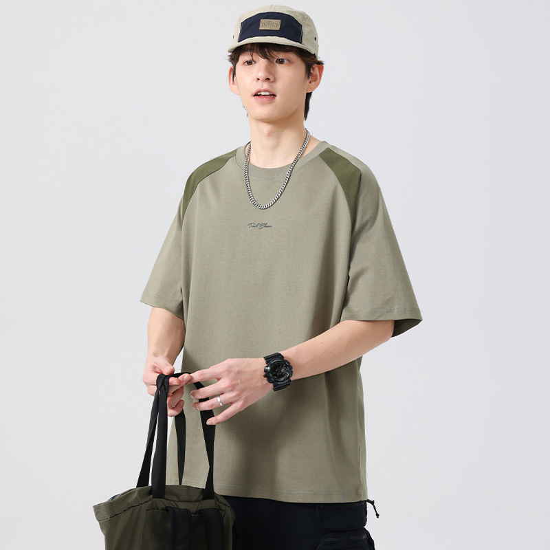 设计感撞色拼接短袖t恤男士宽松圆领落肩袖体恤夏季简约刺绣上衣