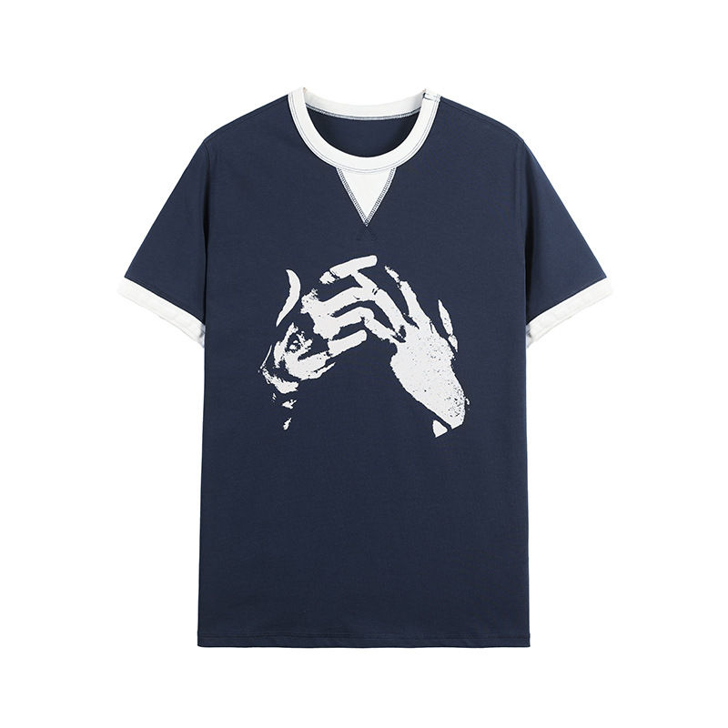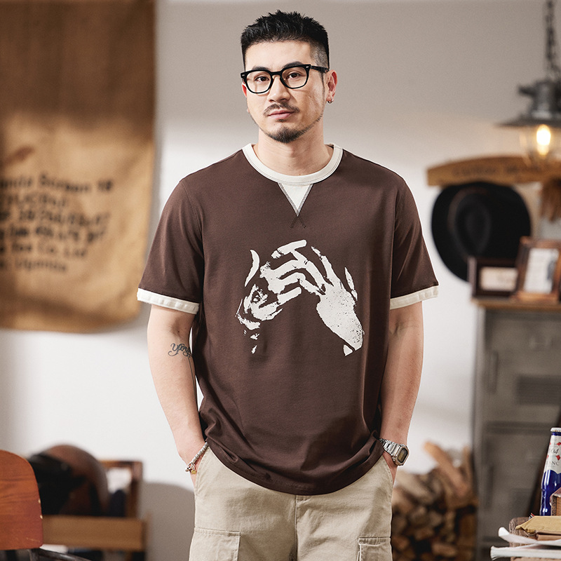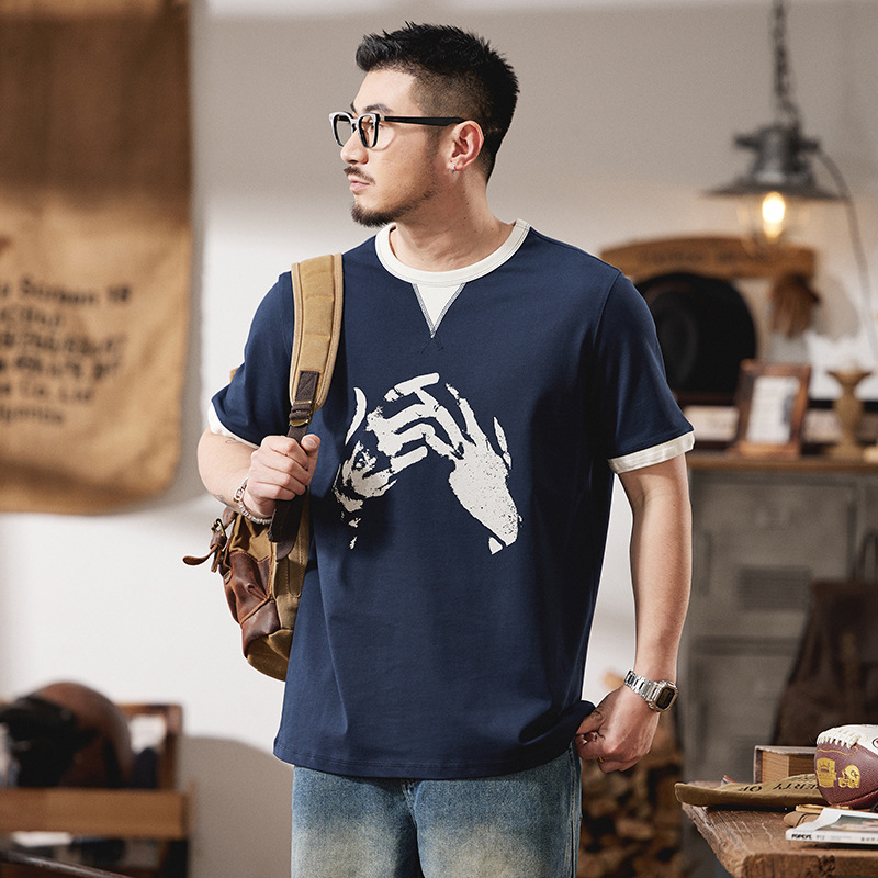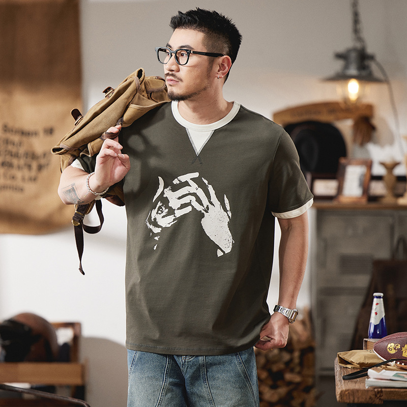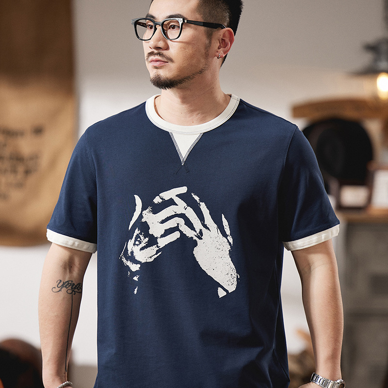 假两件美式复古短袖t恤男夏季2025新款微宽松纯棉手势印花圆领T恤