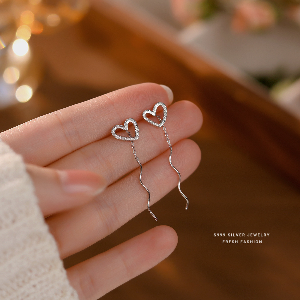 s999足银爱心流苏耳线女款小清新气质耳钉高级感精致心形耳饰