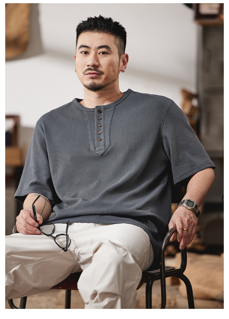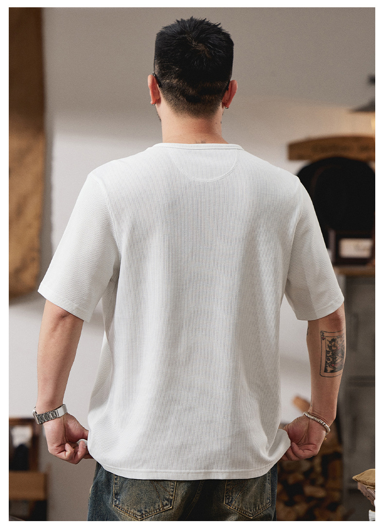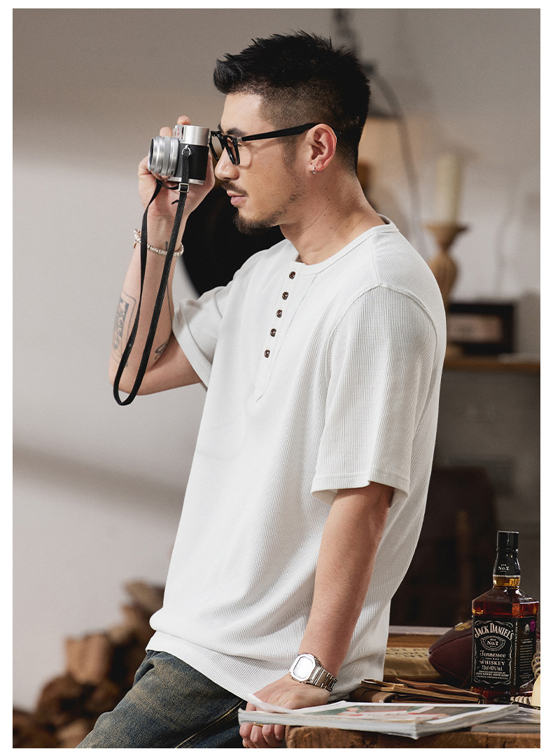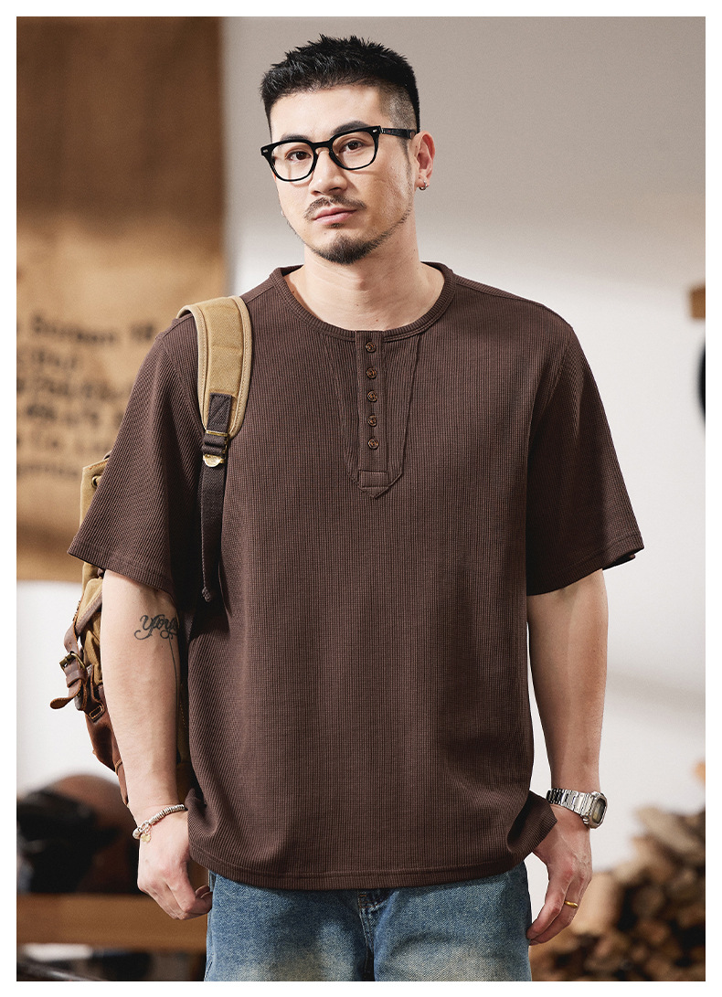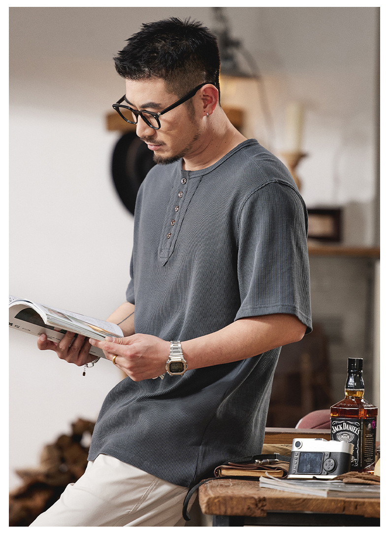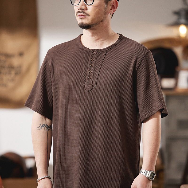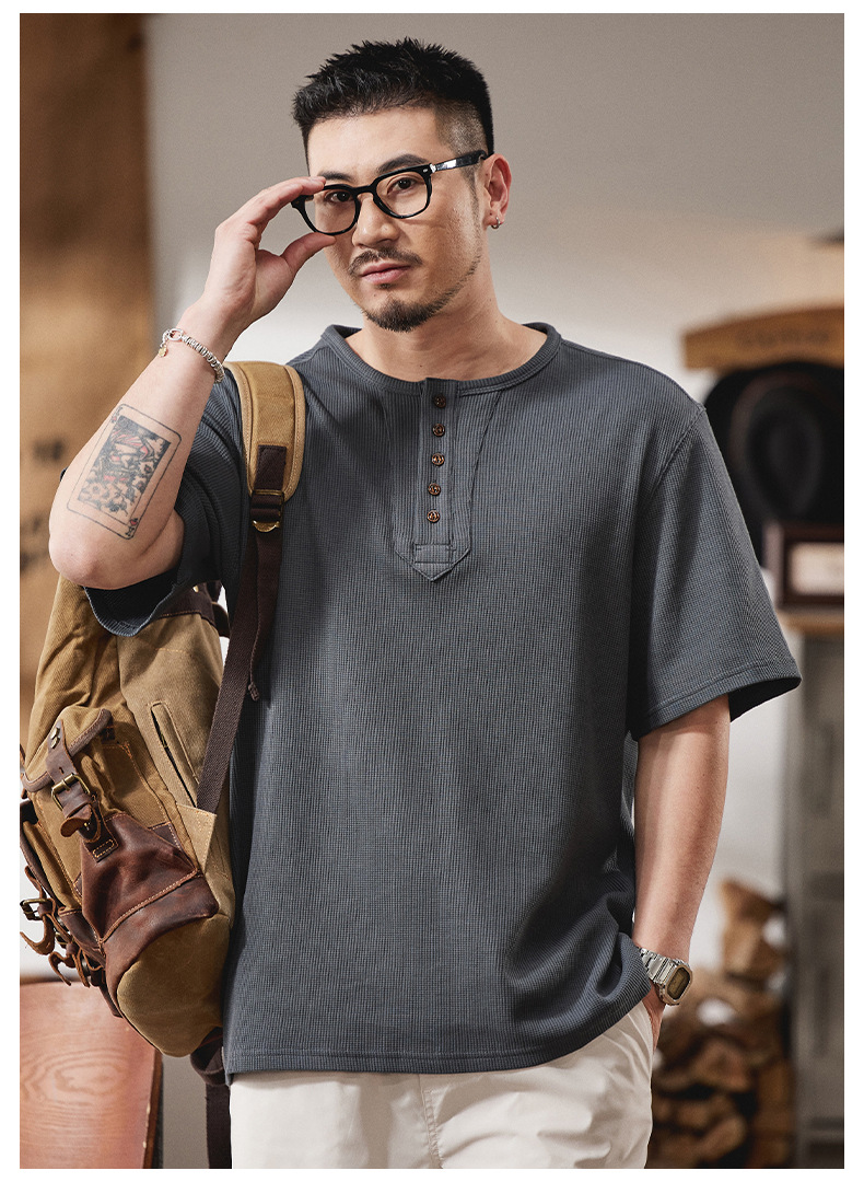 美式复古225G华夫格短袖t恤男亨利领衫宽松夏季薄款透气硬汉穿搭