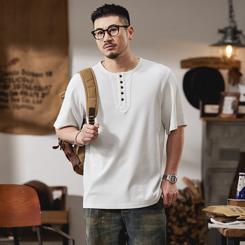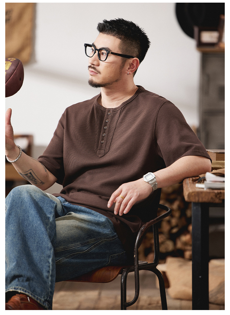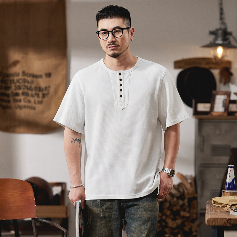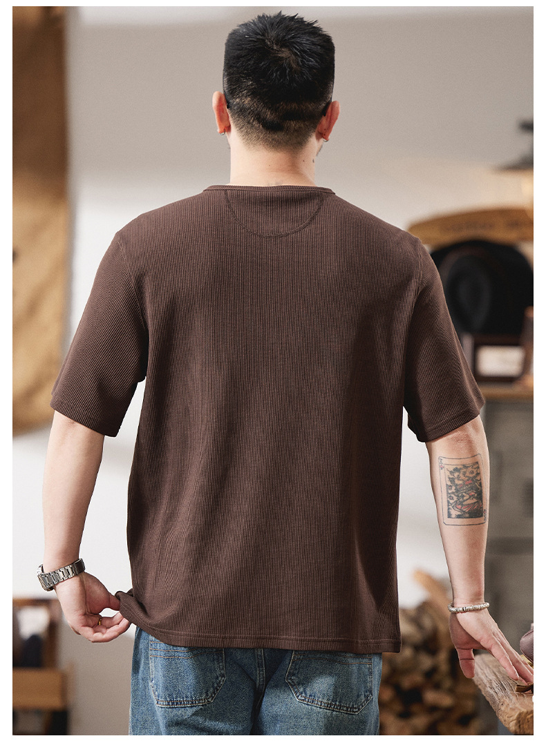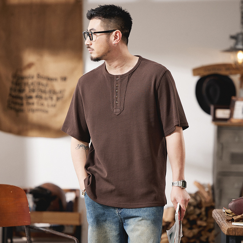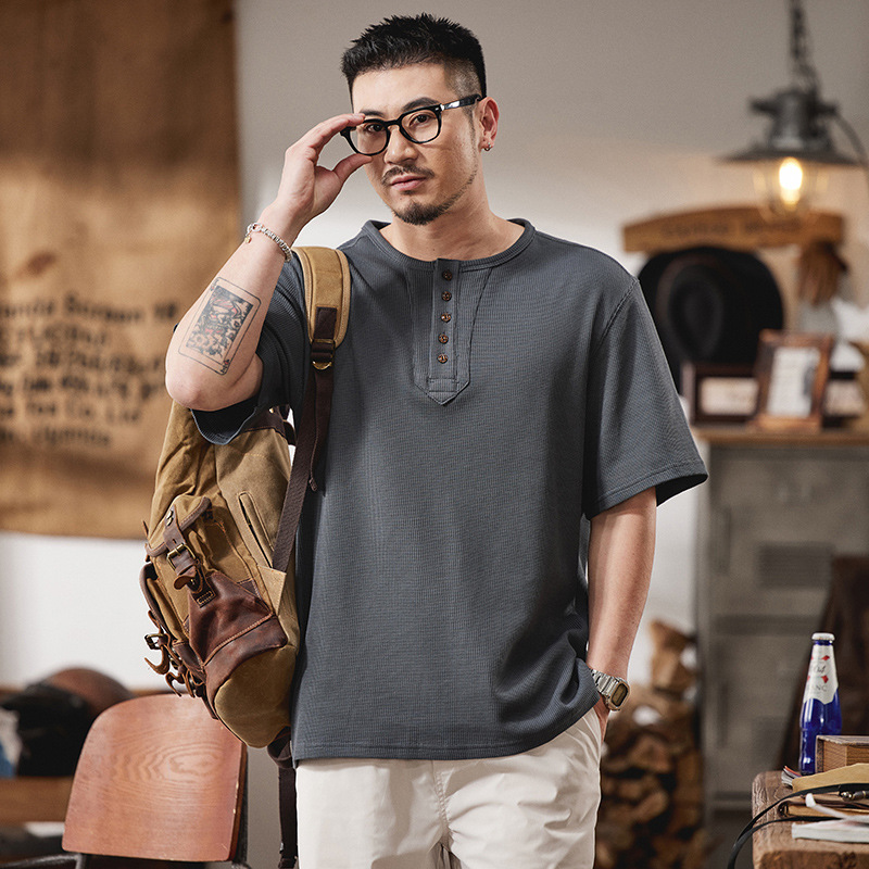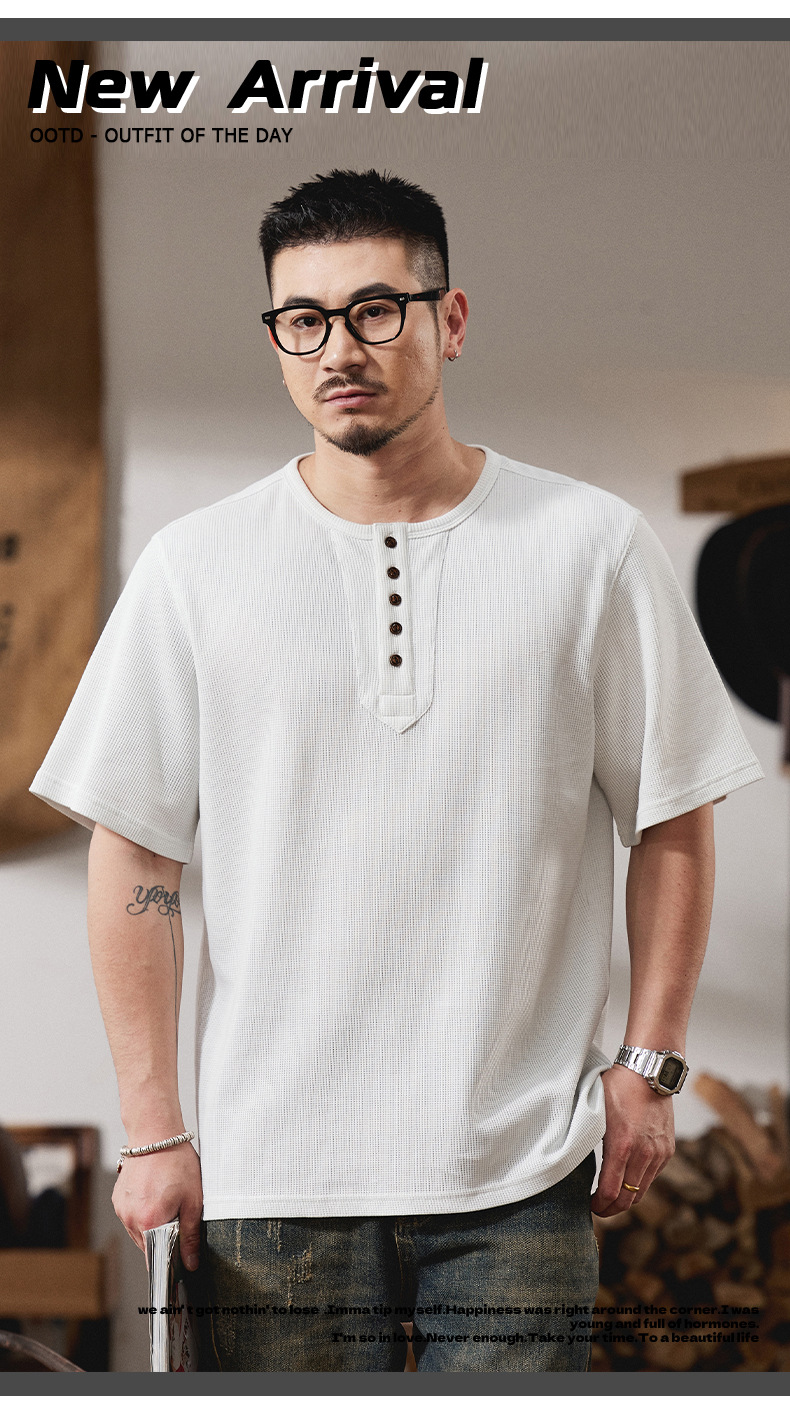 美式复古225G华夫格短袖t恤男亨利领衫宽松夏季薄款透气硬汉穿搭