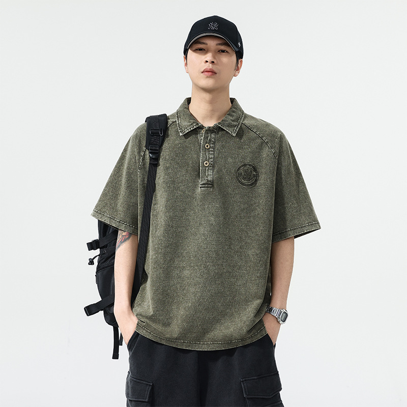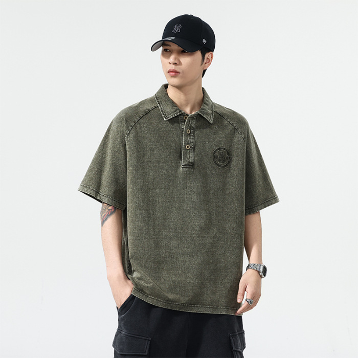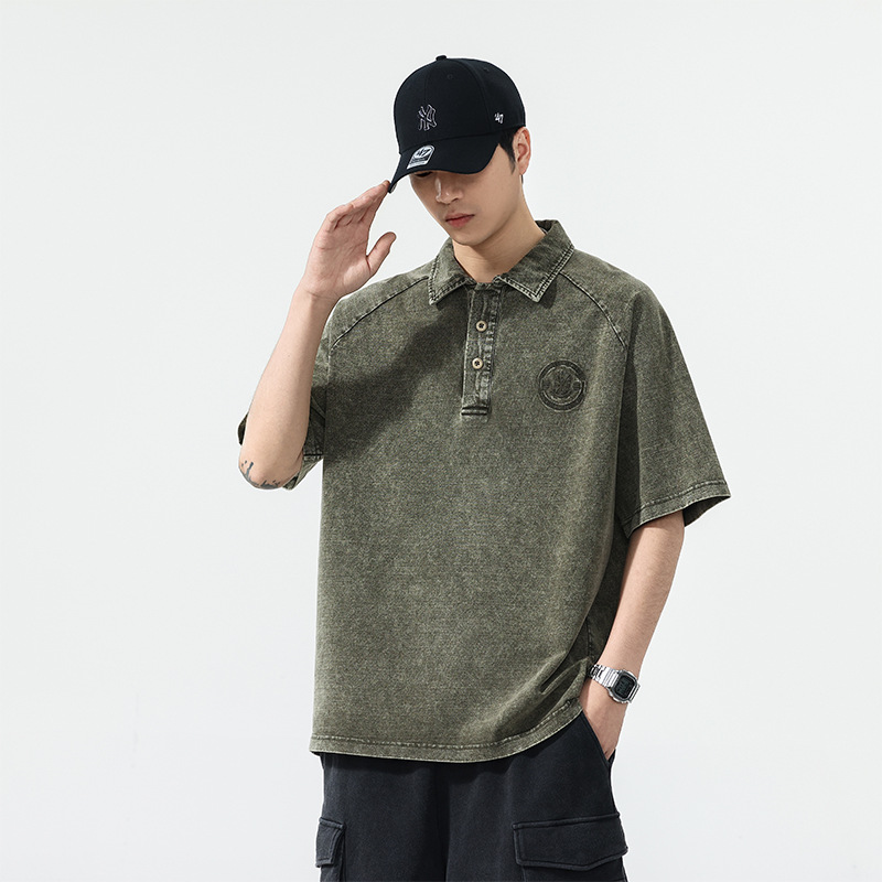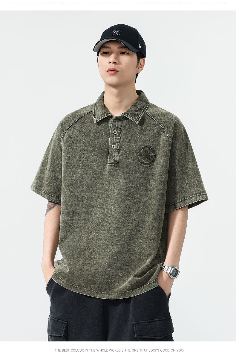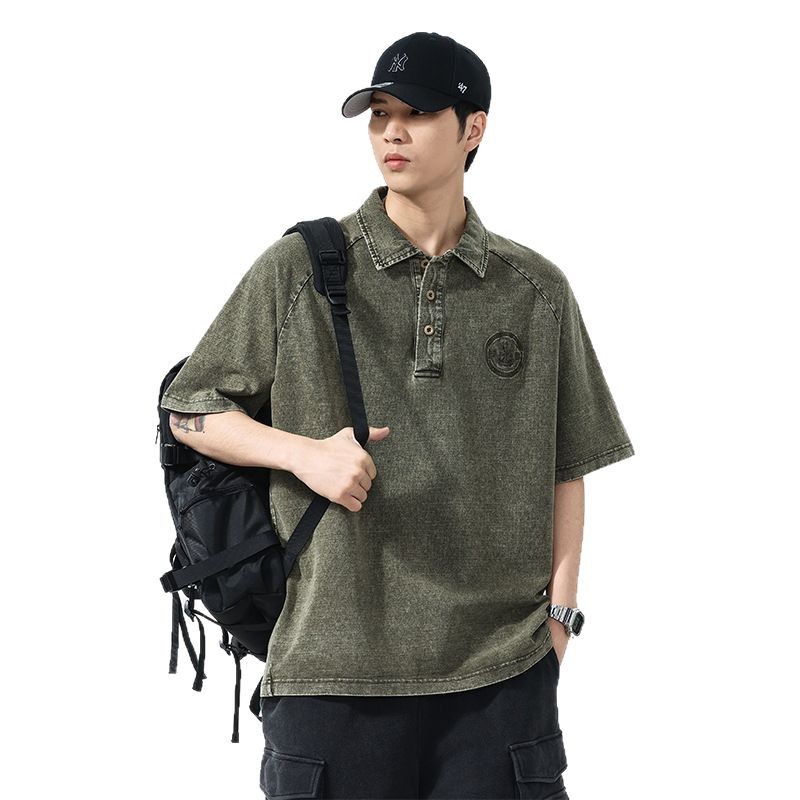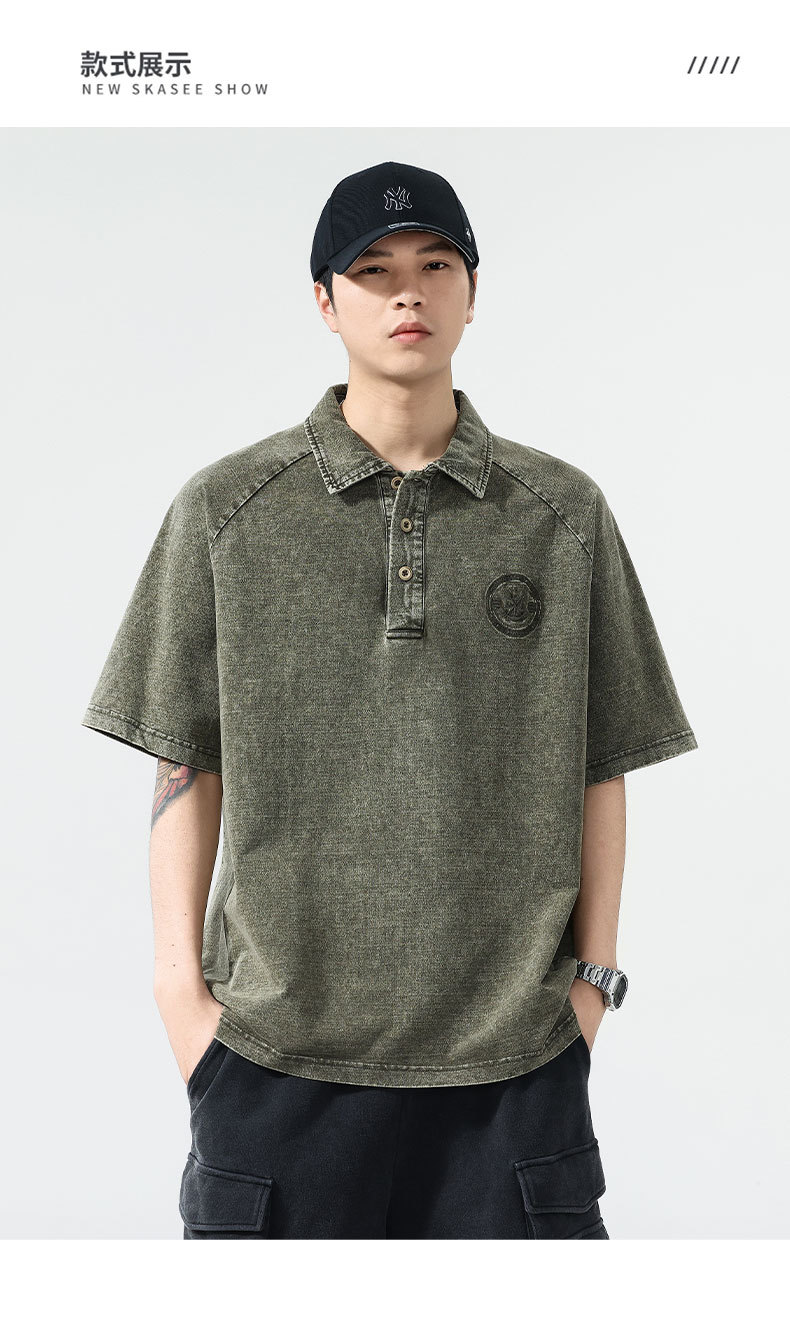 美式复古260g重磅牛仔Polo衫男夏季潮牌短袖男款t恤宽松美式上衣