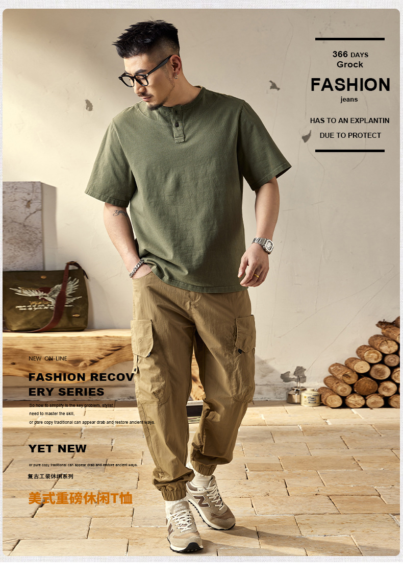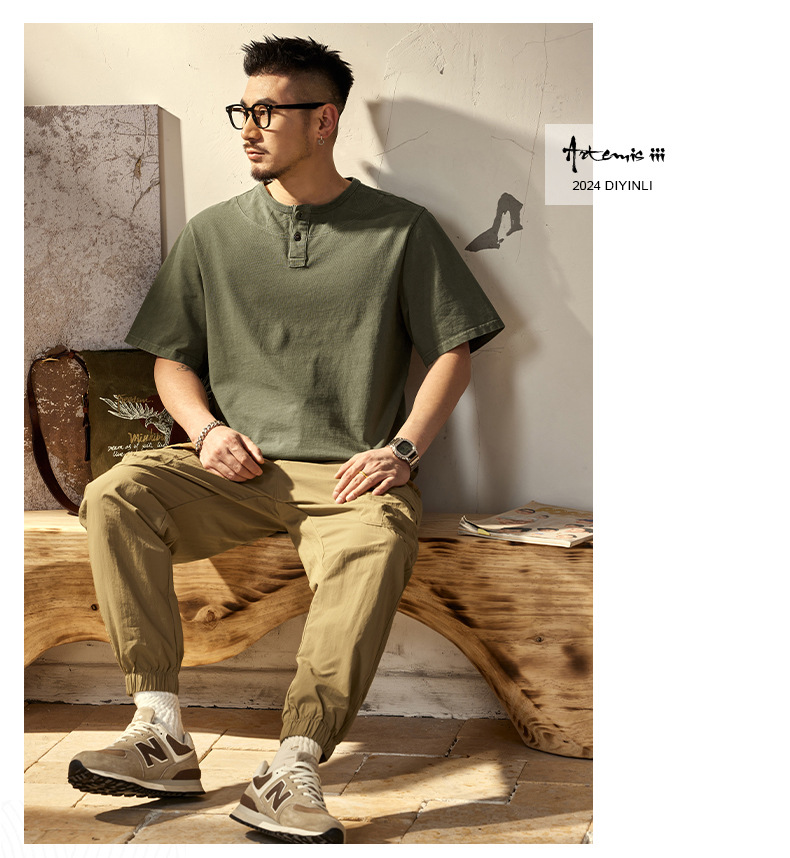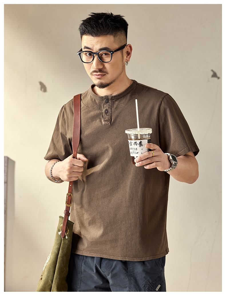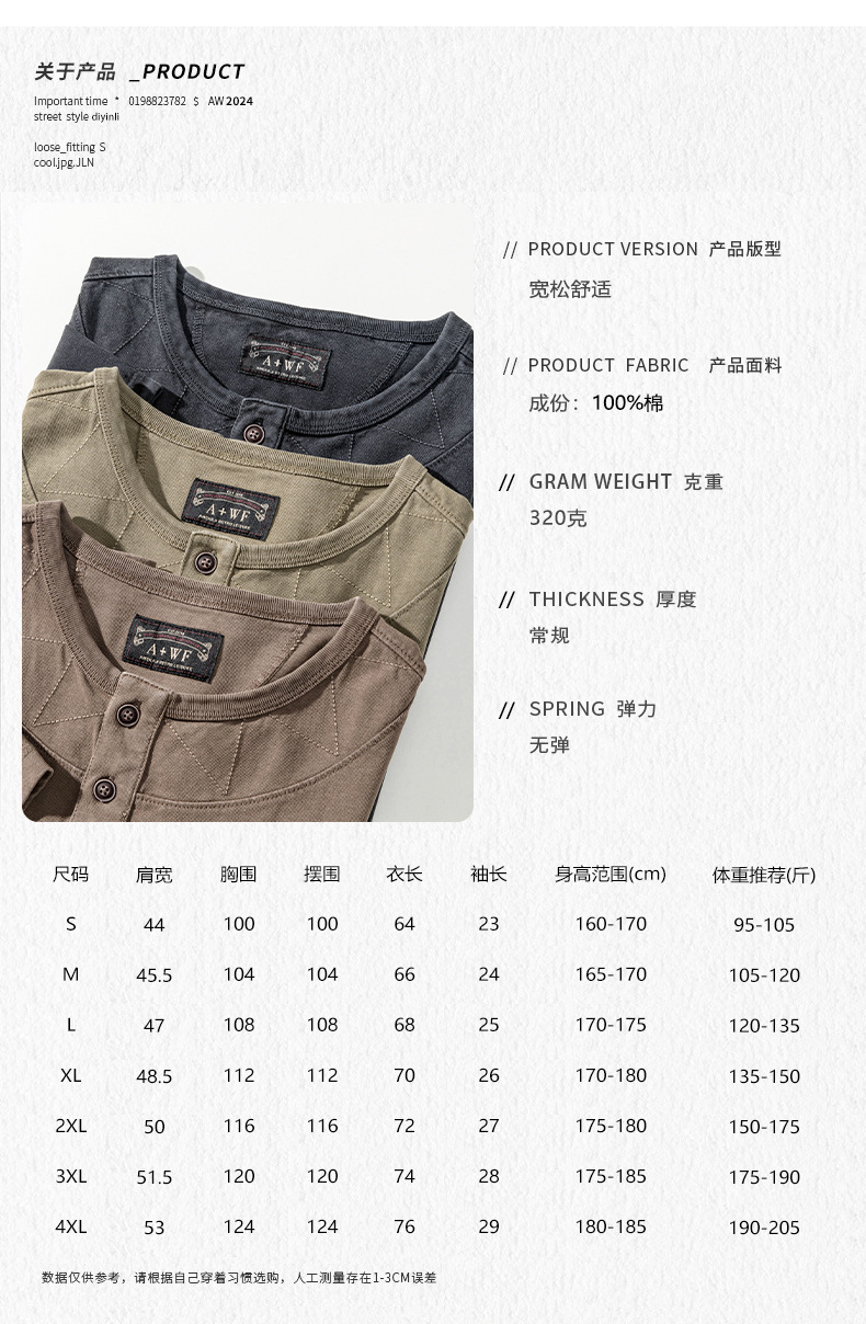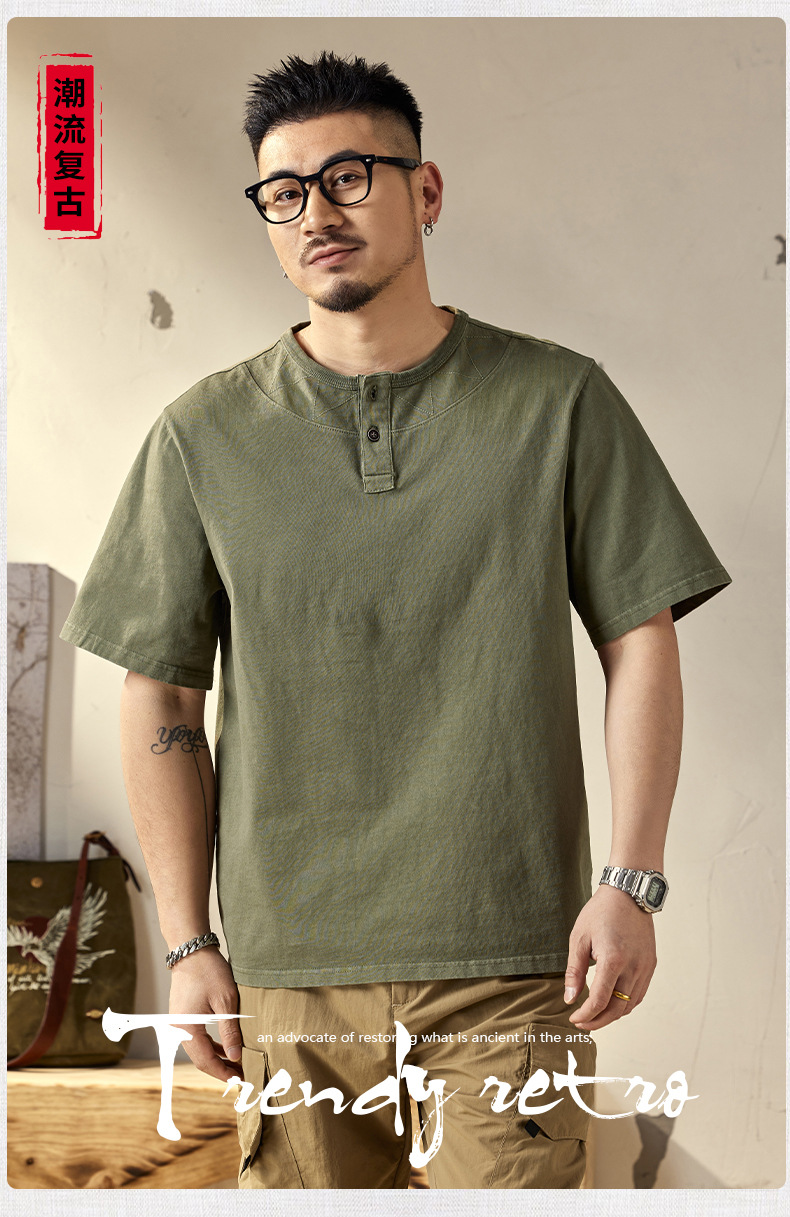 2025夏季新款亨利领短袖t恤男宽松圆领百搭半袖美式复古重磅体恤T