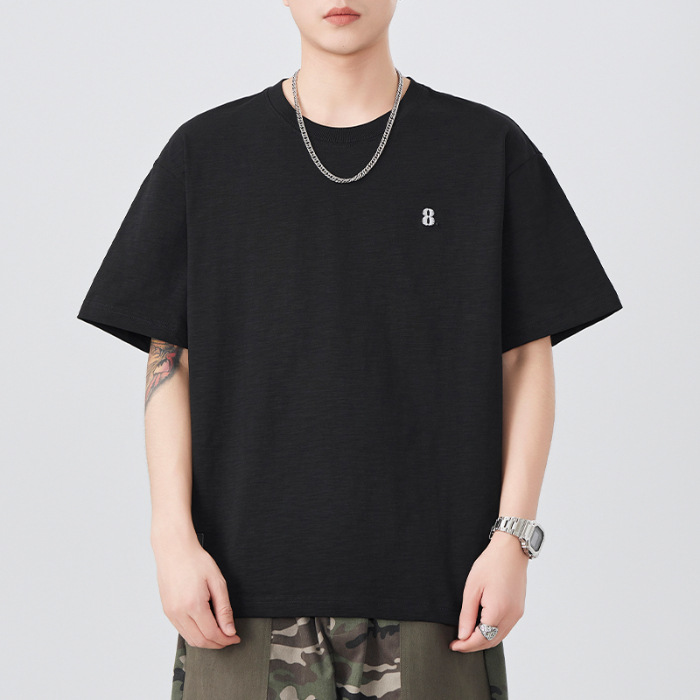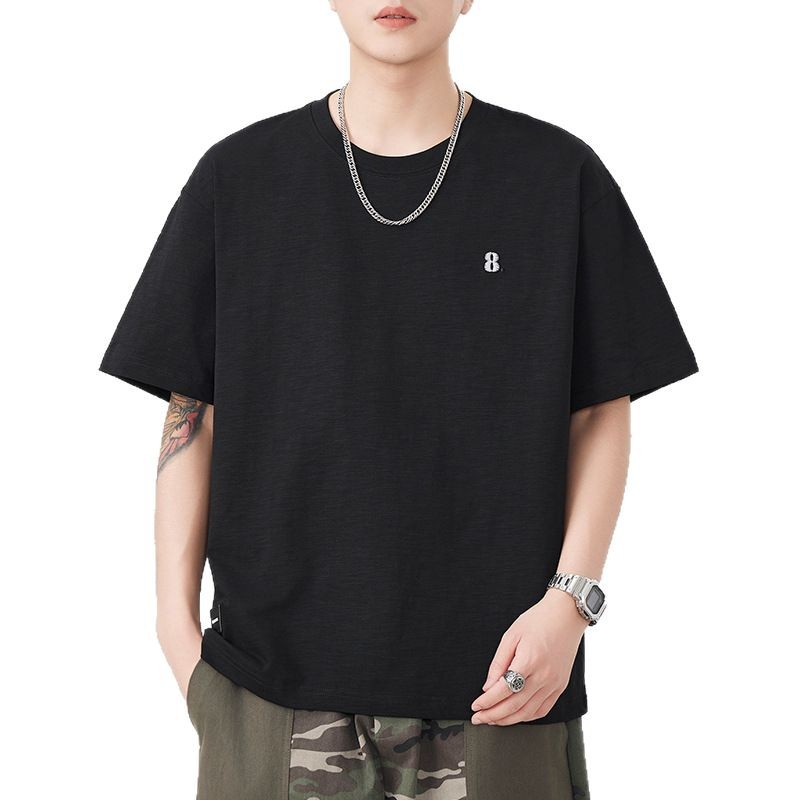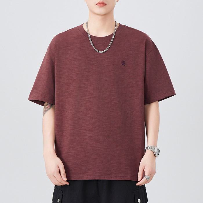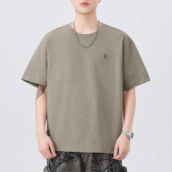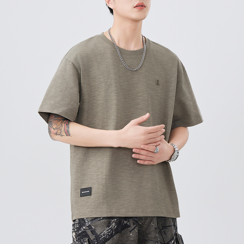 卡其色T恤男士透气竹节棉刺绣打底衫夏季新款宽松大码休闲短袖男