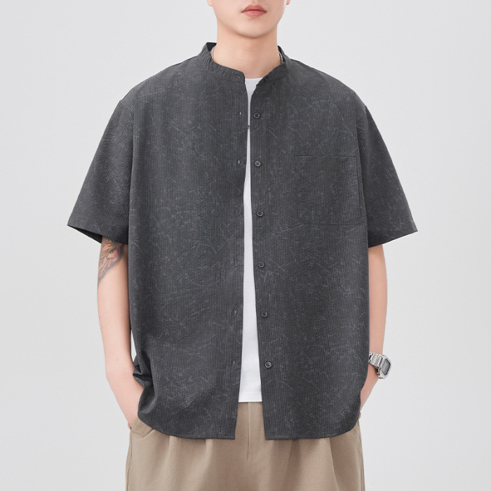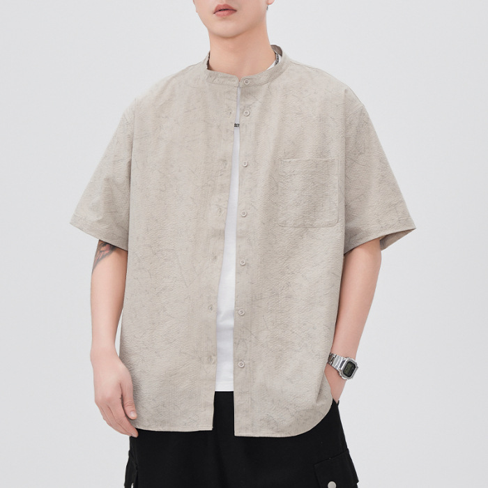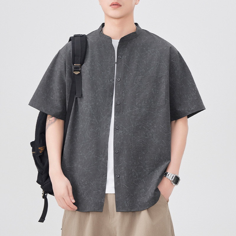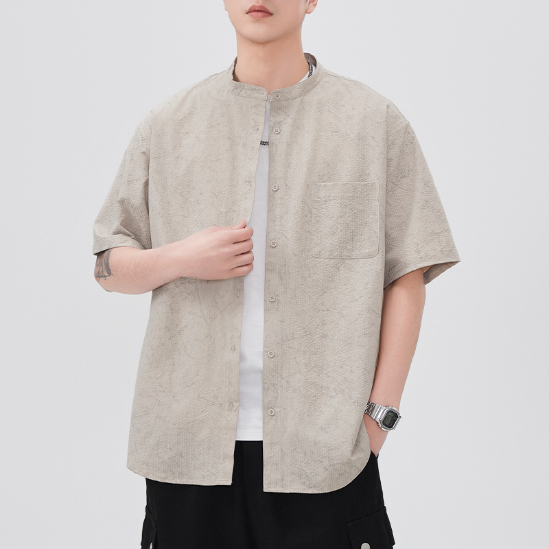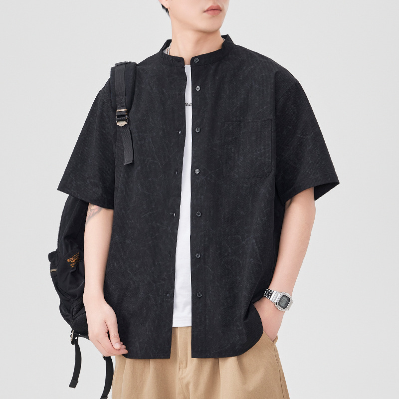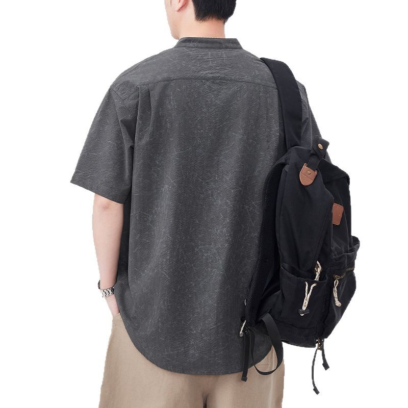 美式复古短袖衬衫男士夏季潮牌新款宽松休闲立领半袖衬衣外套