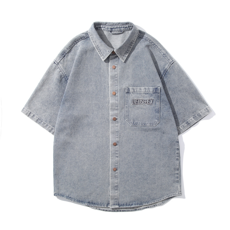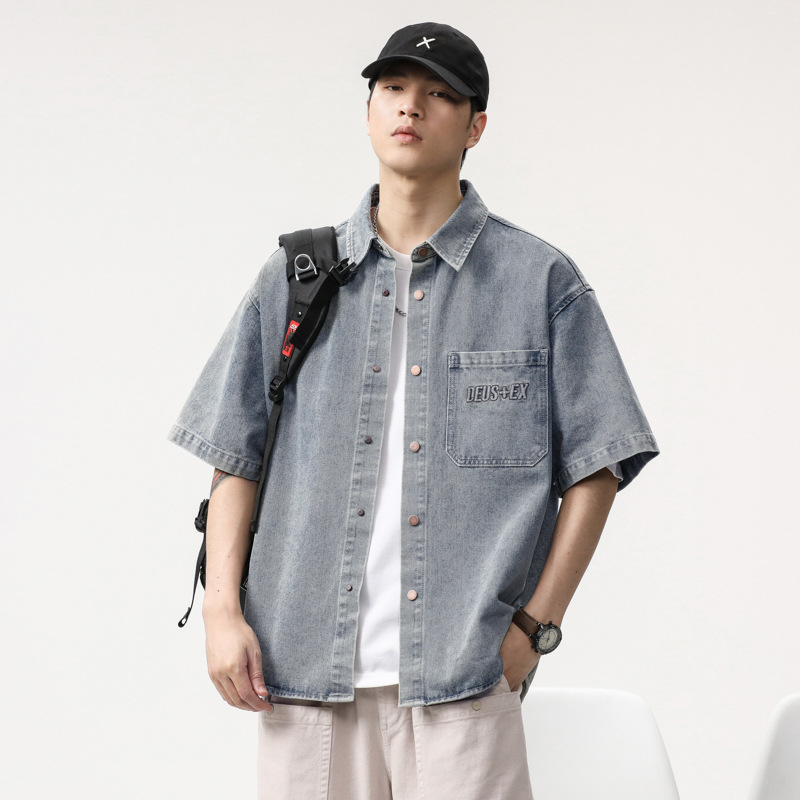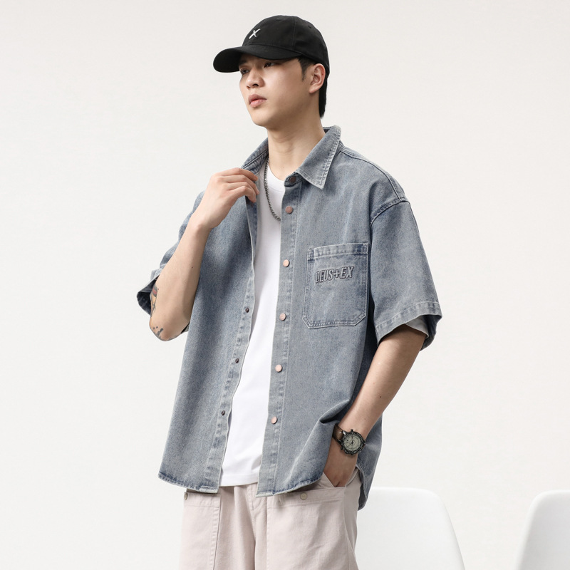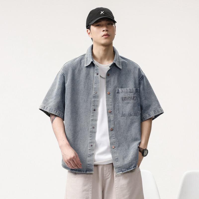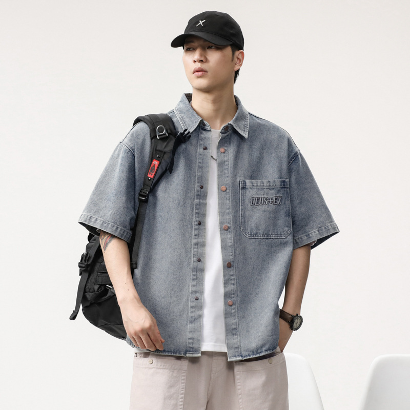 美式复古简约牛仔短袖衬衫外套男生夏季2025新款高级感痞帅寸衣服