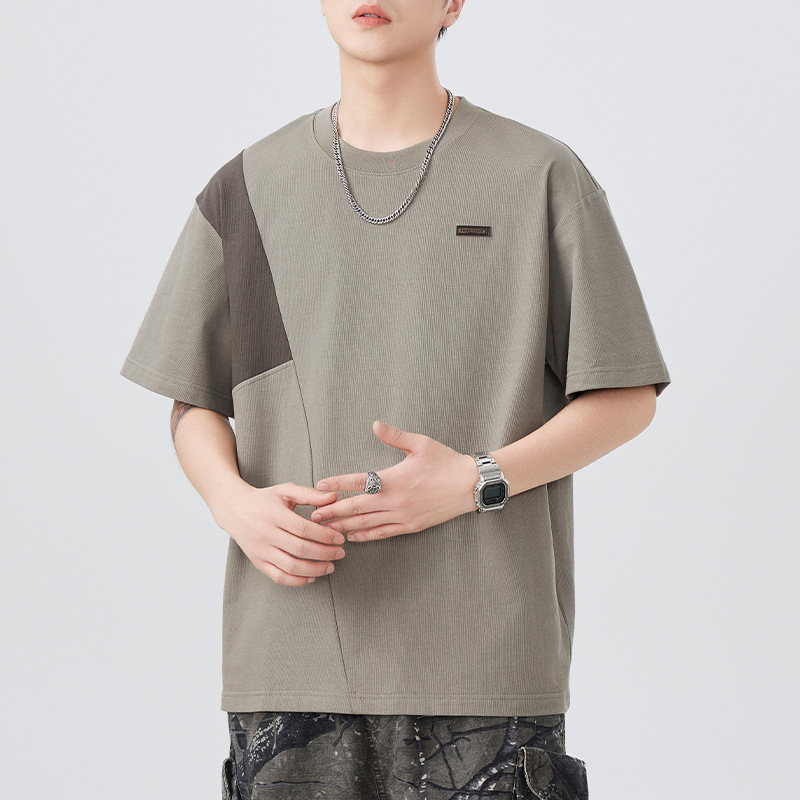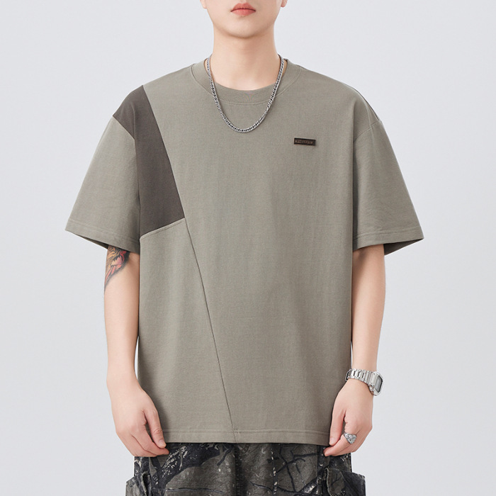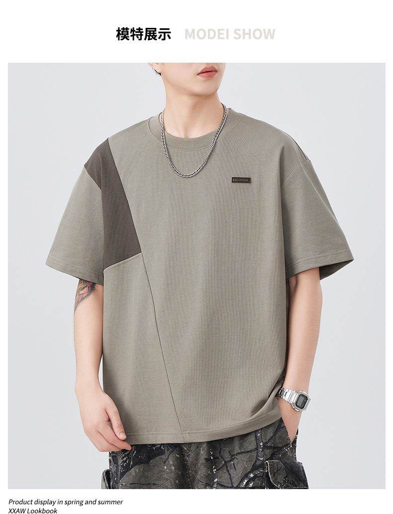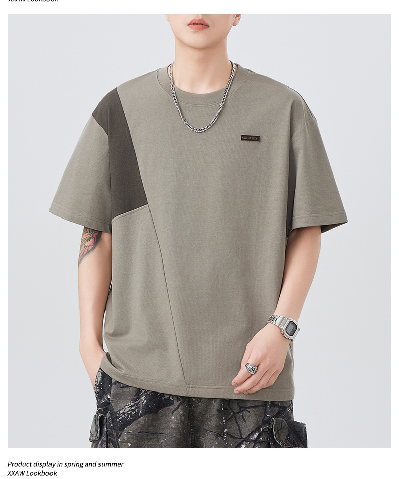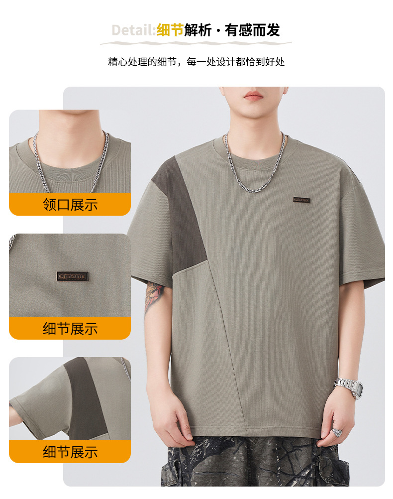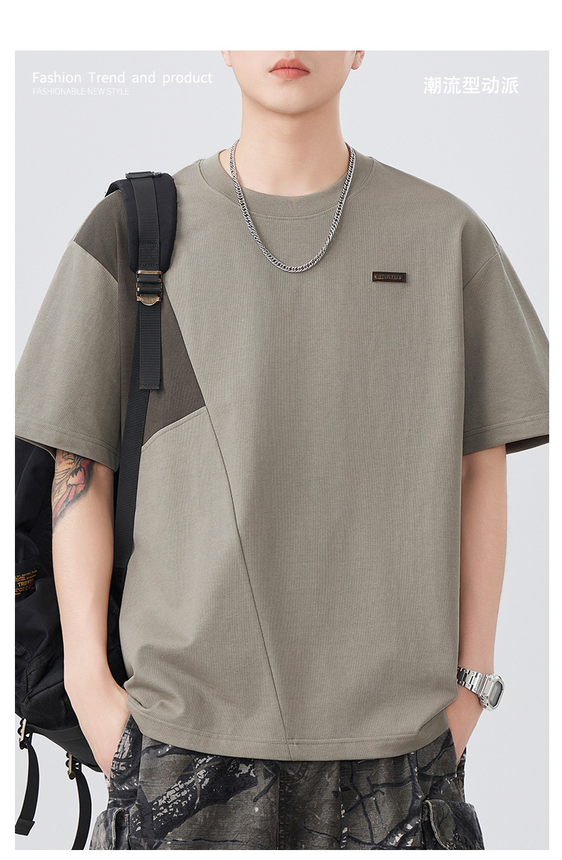 夏季新款双色拼接T恤男生2025新款休闲短袖卡其色宽松圆领体恤衫