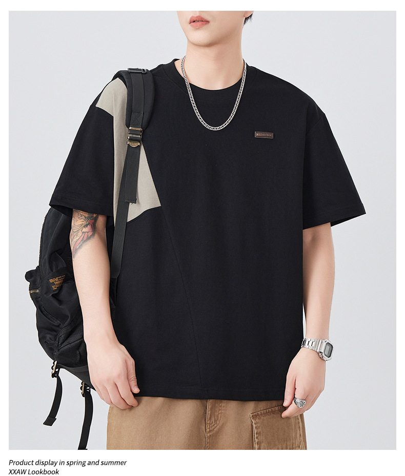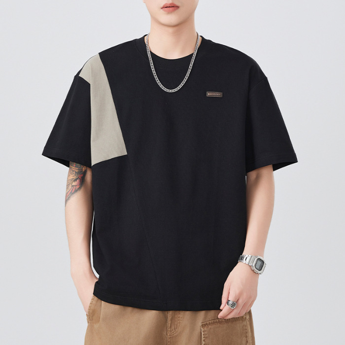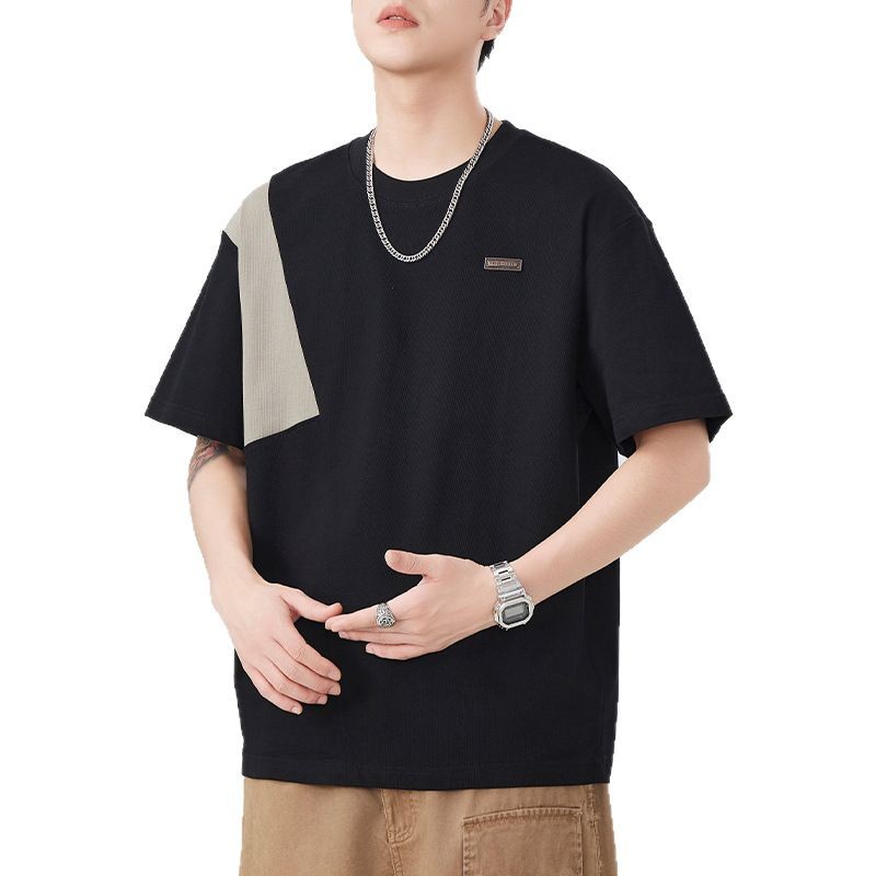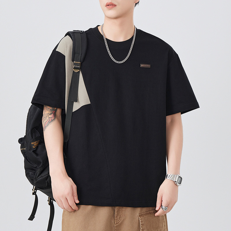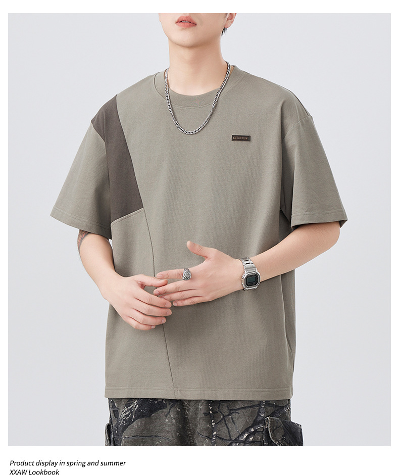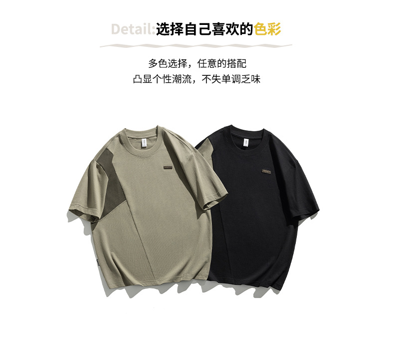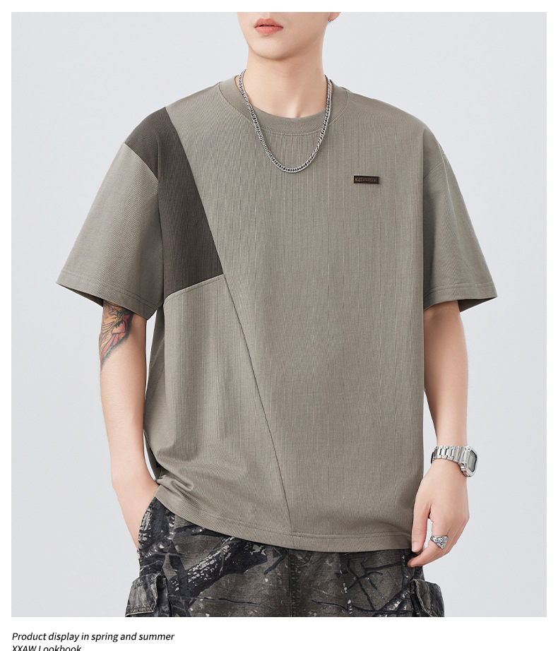 夏季新款双色拼接T恤男生2025新款休闲短袖卡其色宽松圆领体恤衫