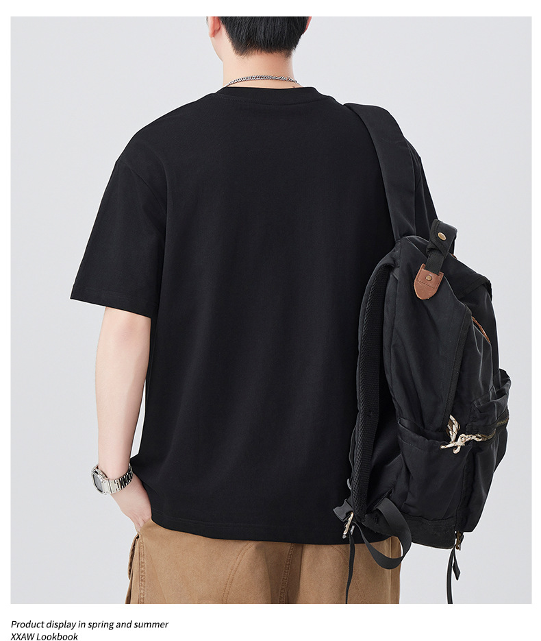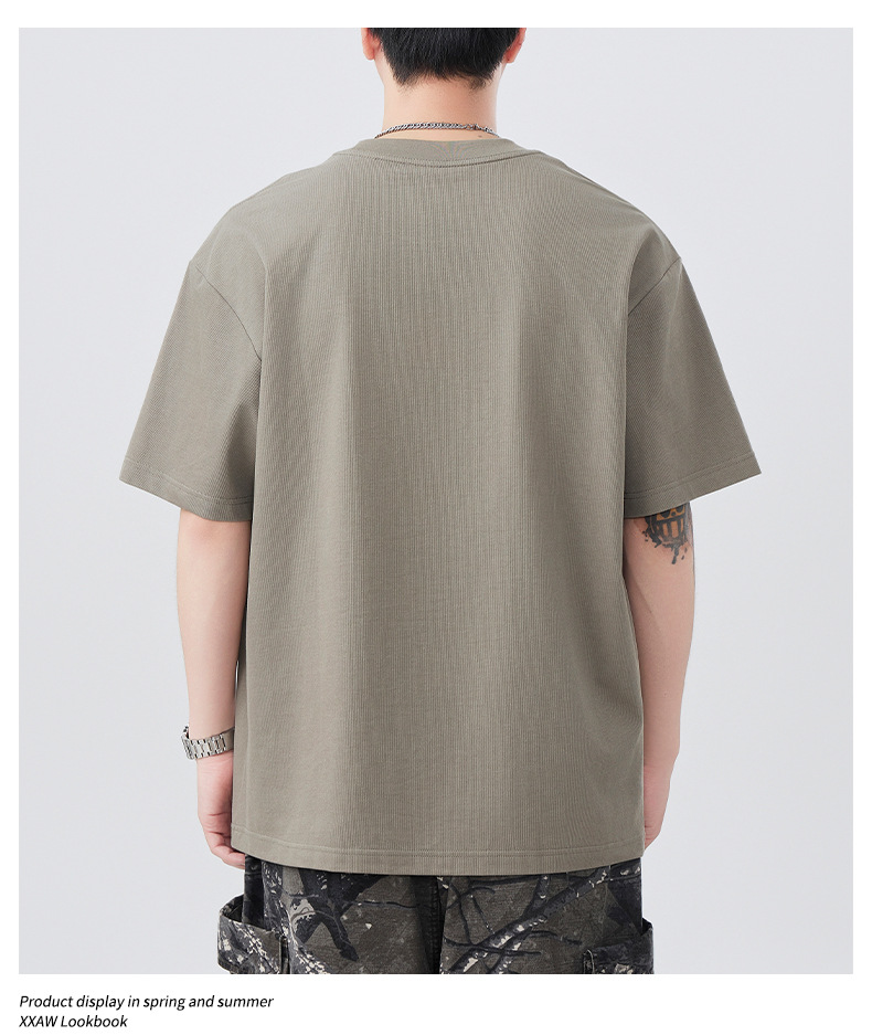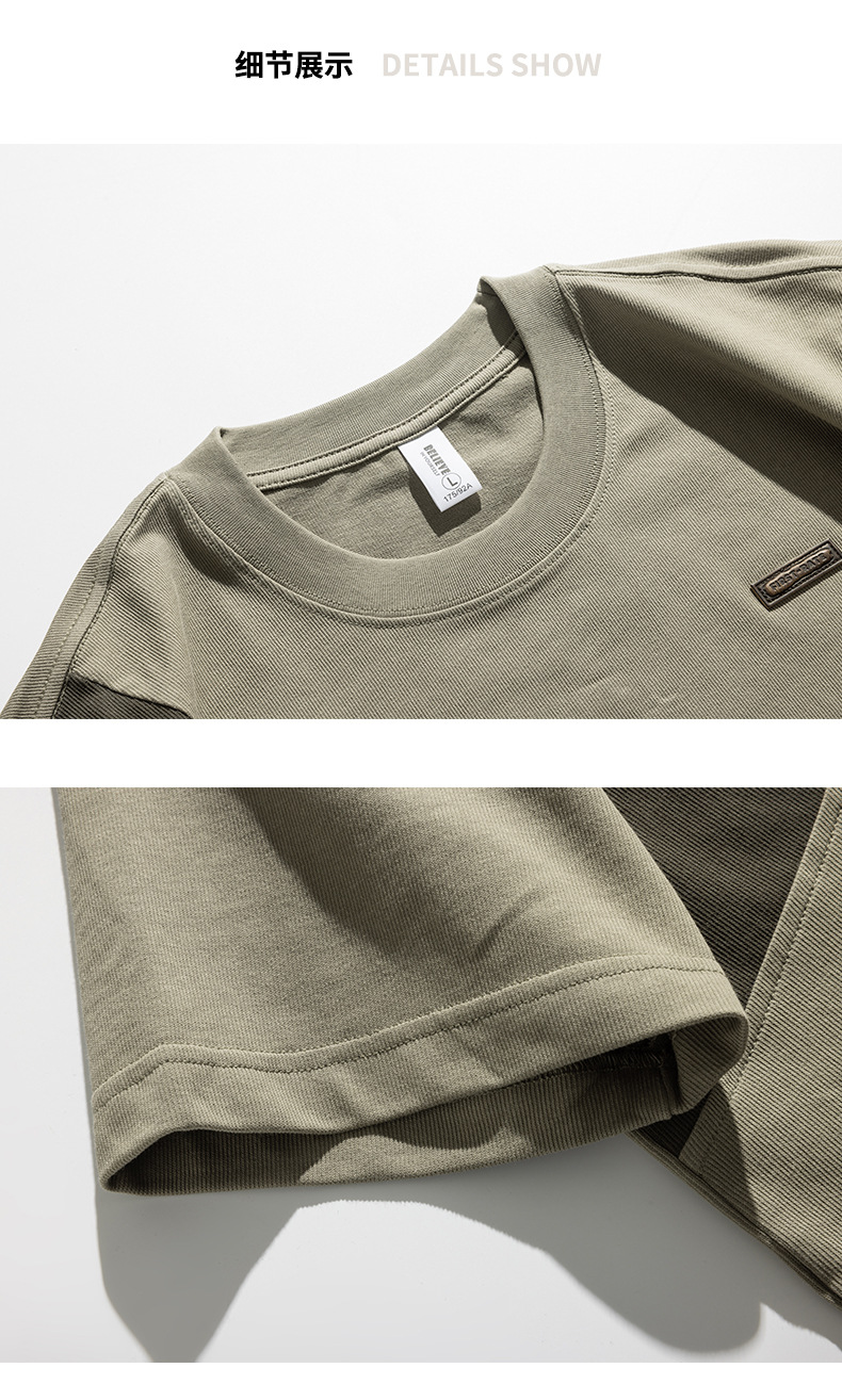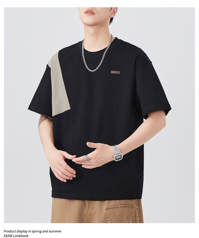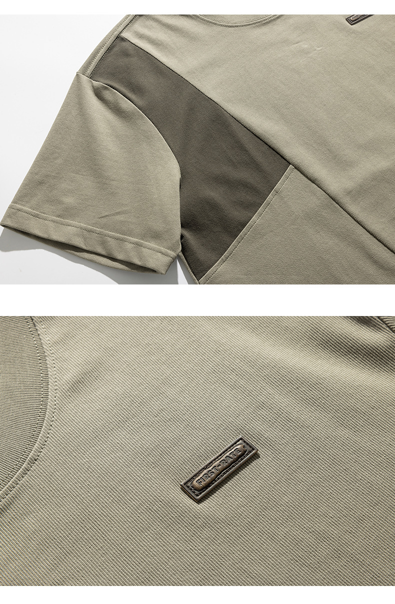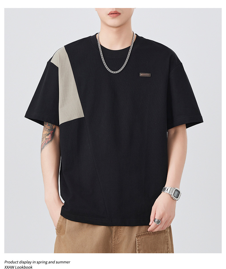 夏季新款双色拼接T恤男生2025新款休闲短袖卡其色宽松圆领体恤衫